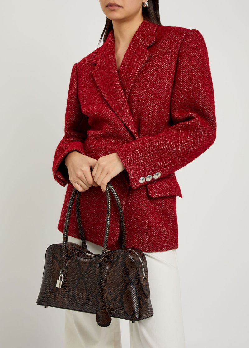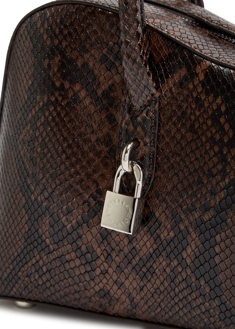 Stella McCartney faux leather shoulder bag. Snake effect, two top handles with press-stud fastening tab, detachable designer-engraved padlock, detachable designer-stamped tag, designer stamp, feet, internal slip pockets, fully lined.
