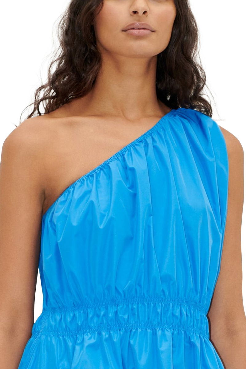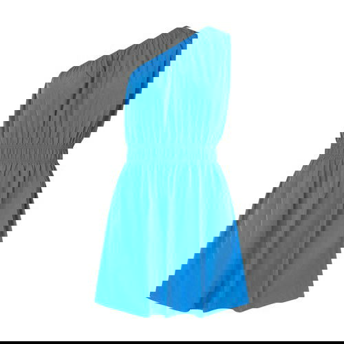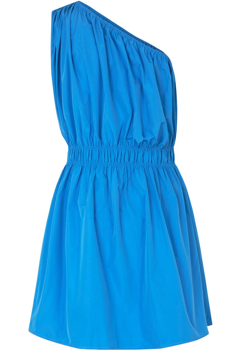 Short dress. Elasticated waist. Asymmetric neckline. Sleeveless. Bare shoulders. Gathered details. Zippered pockets.