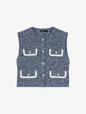 Vest, Houndstooth, Tweed, Frayed, Button fastenings through front, Fully lined, Mid-weight, non-stretchy fabric.