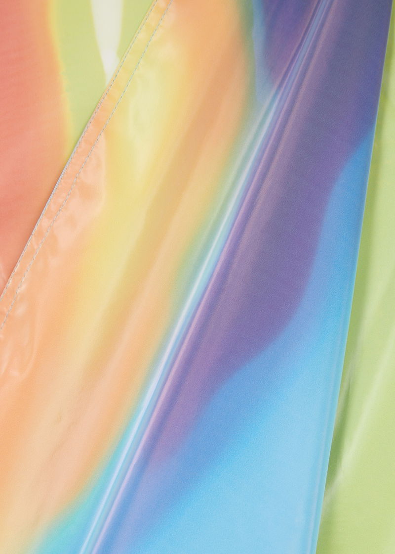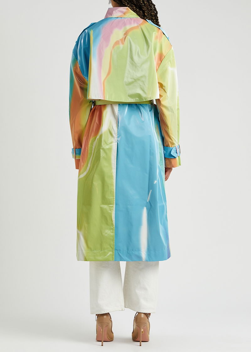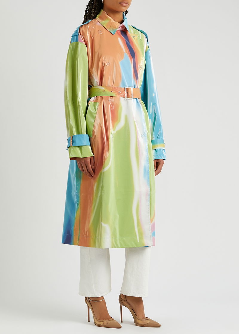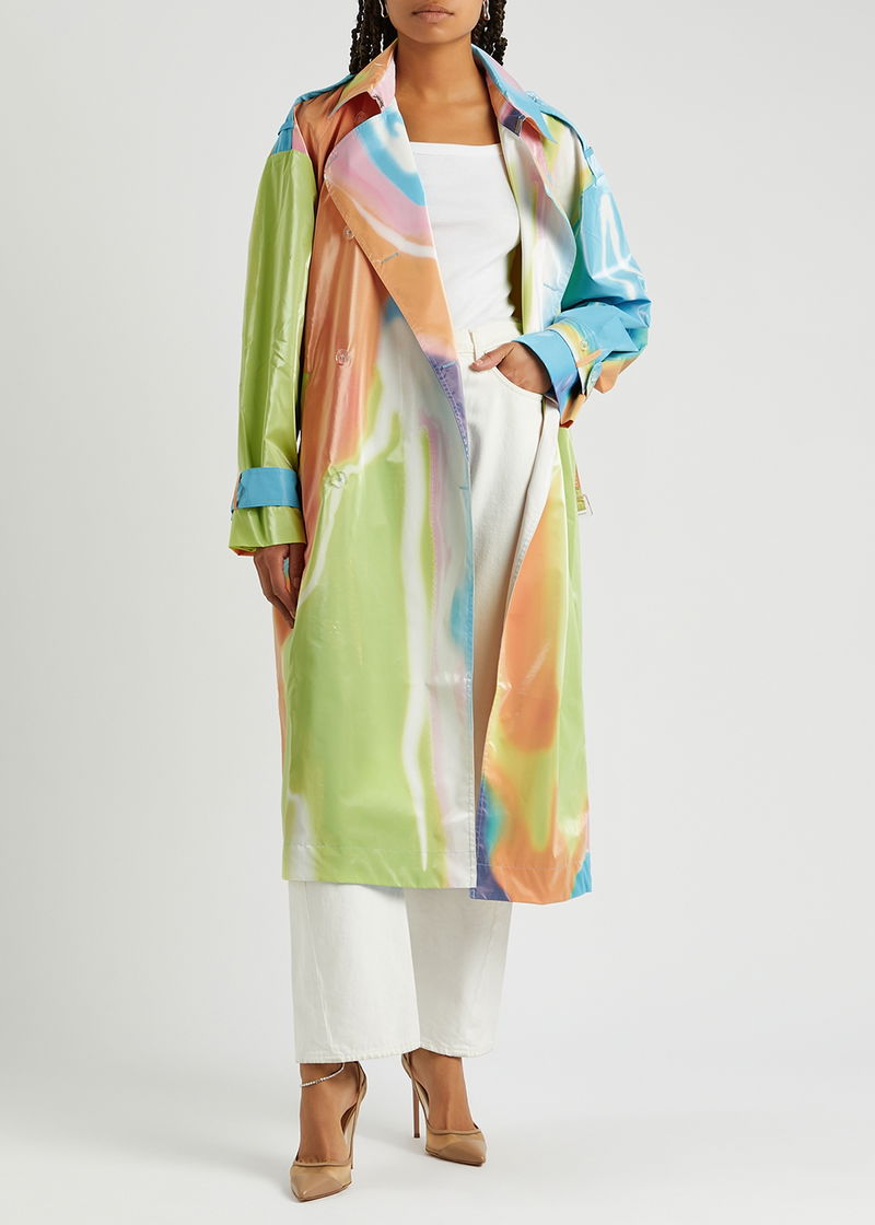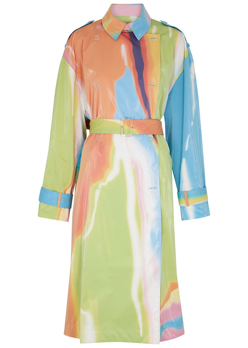 Stine Goya rubberised trench coat. Printed, button-fastening epaulettes, raglan sleeves, belt loops and adjustable button-fastening belted cuffs, two slip pockets, belt loops, detachable waist tie, storm flap, back vent, sheen finish, fully lined. Double-breasted button fastenings through front.