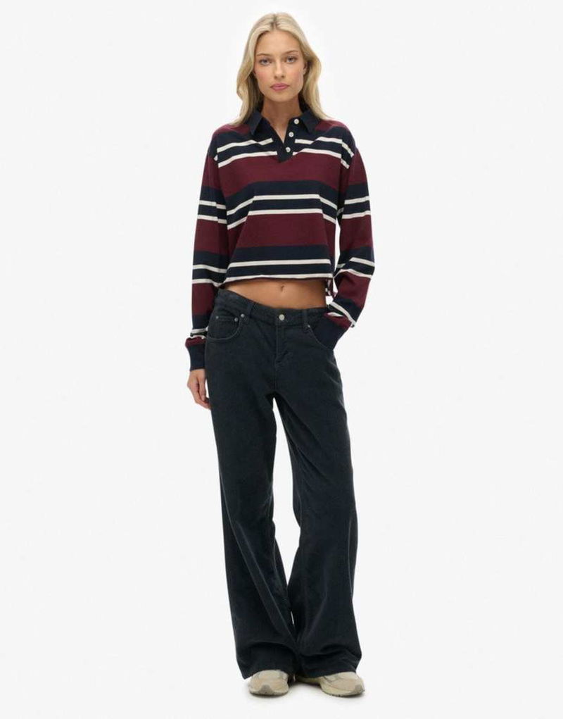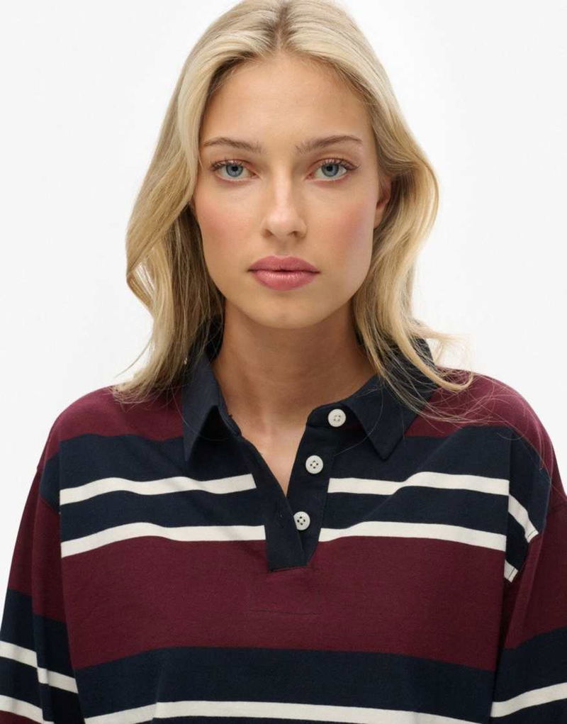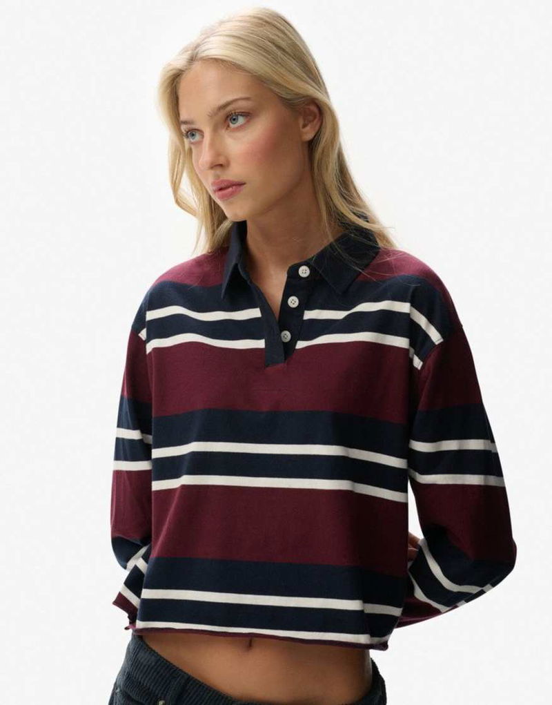 Athletic Essentials Cropped Stripe Rugby Top In Port Red/ecru Stripe