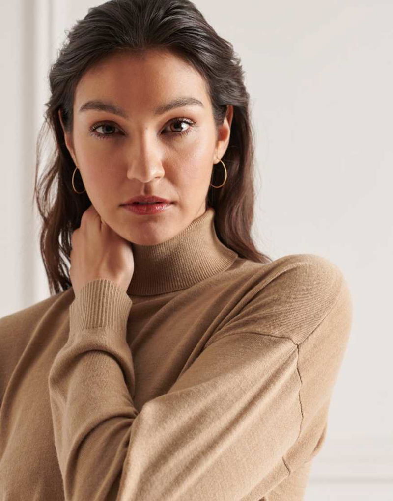 Merino drop shoulder roll neck jumper.