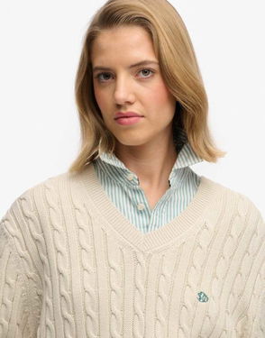 Oversized V Neck Cable Jumper, Oatmeal Beige