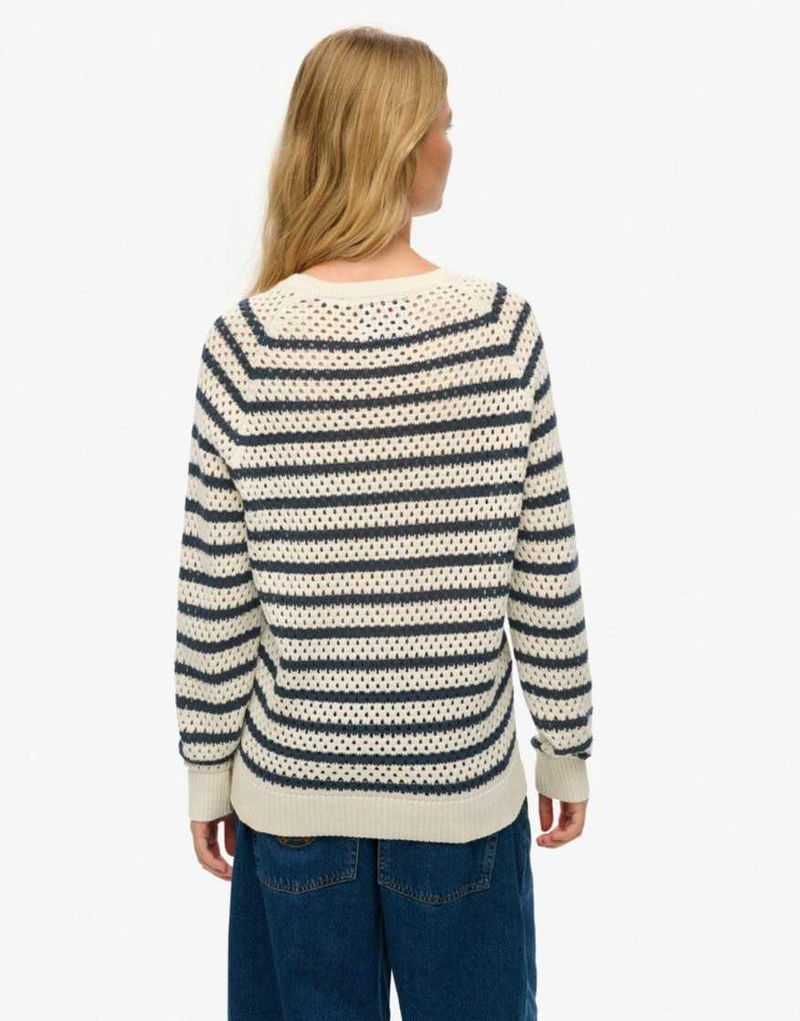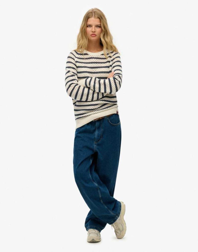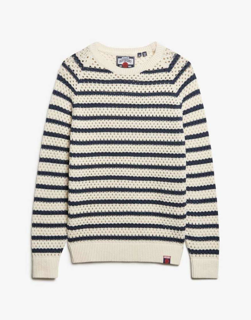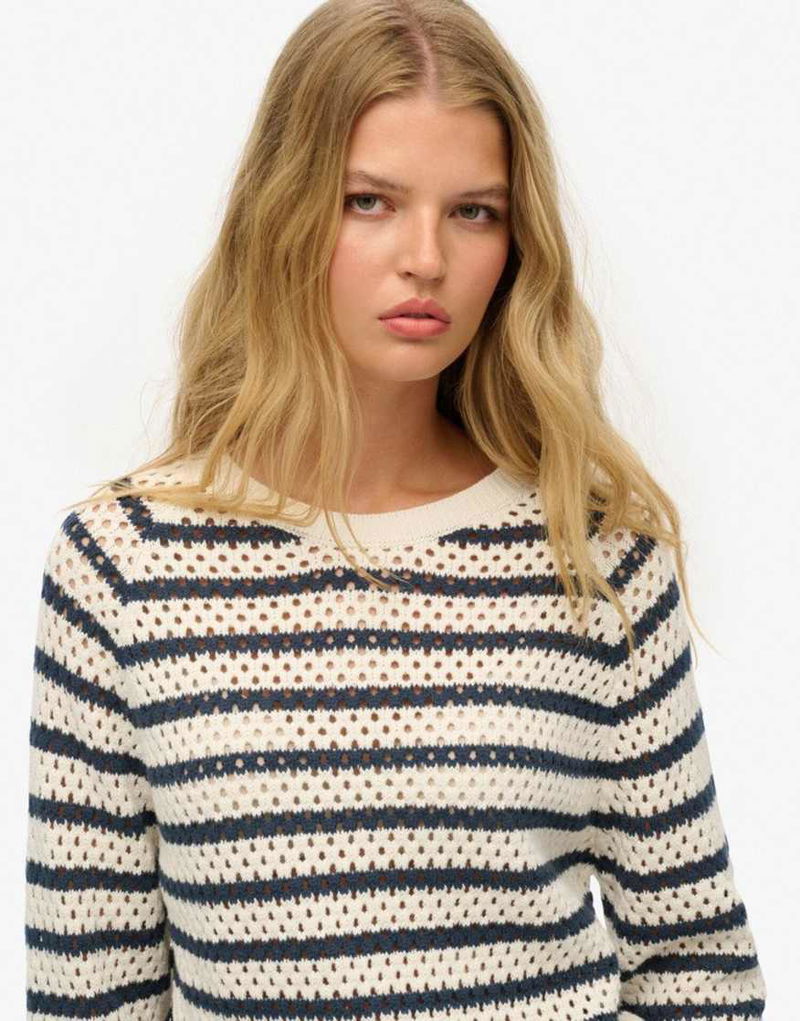 Stripe Crochet Slouchy Crew Jumper In Natural White Stripe