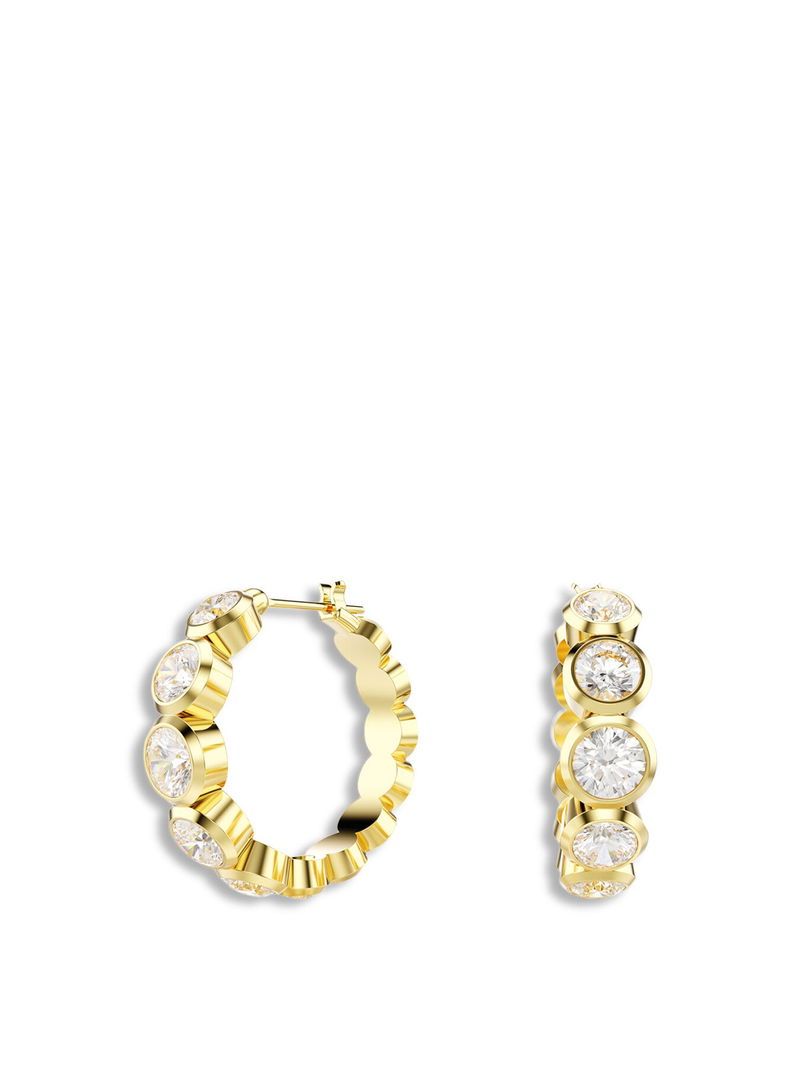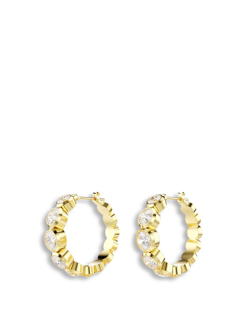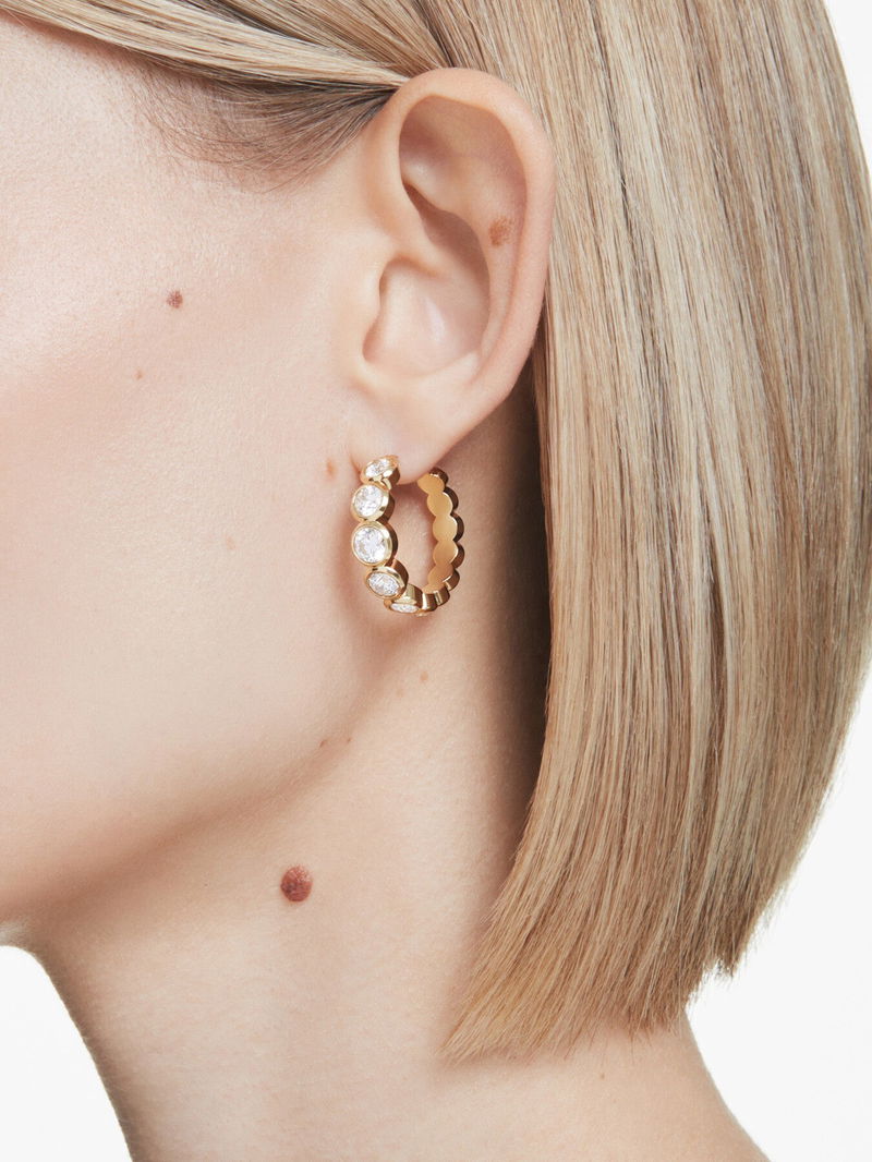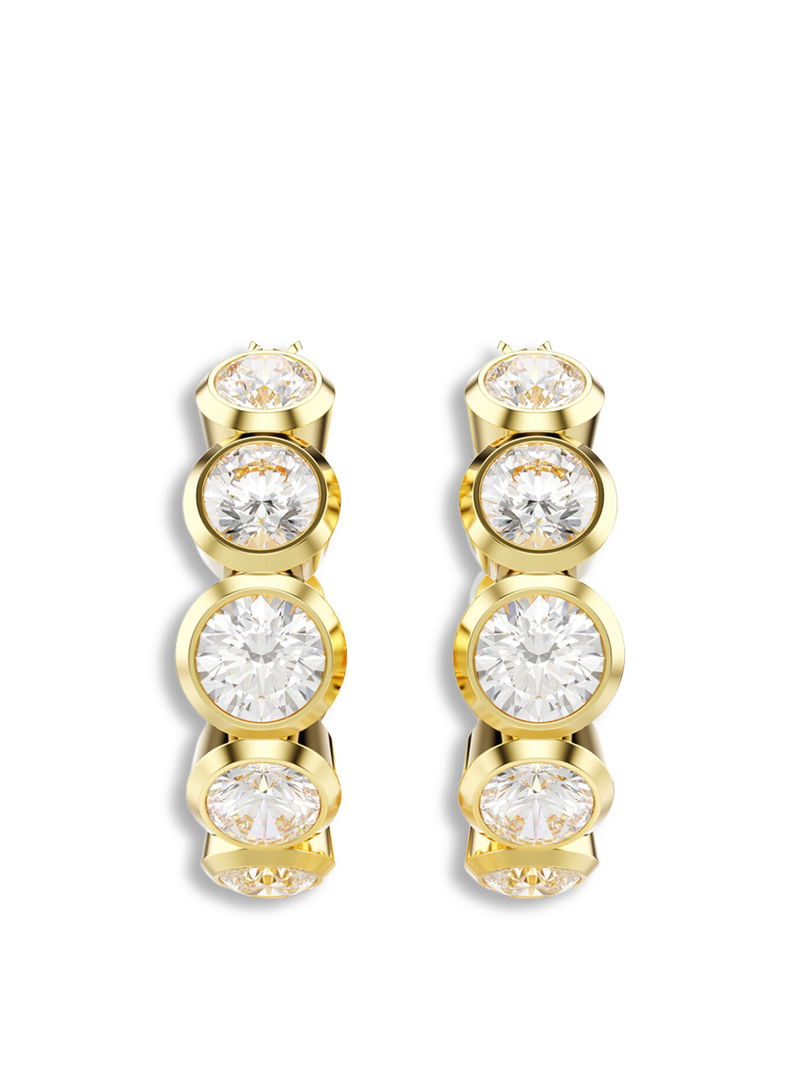 Maximise your elegance with these radiant mini hoops. The gold-tone plated pieces are masterfully crafted with a circle of round-cut Swarovski Zirconia, each placed in a modern bezel setting and presented in a gradient of sizes. A perfect pair for everyday sophistication, or a glowing choice for evening glamour.