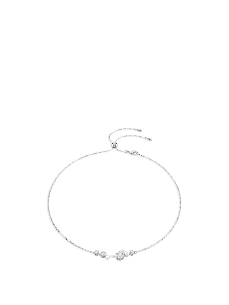 The Constella Bar Necklace by Swarovski features a row of clear crystals set in rhodium plating. Sleek and architectural, it captures the house’s expertise in light and clarity.