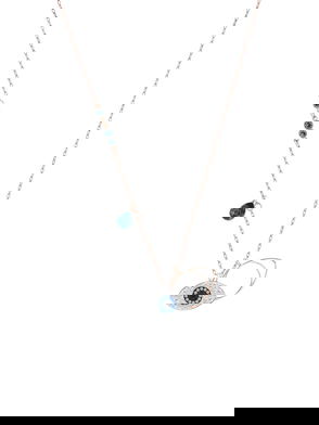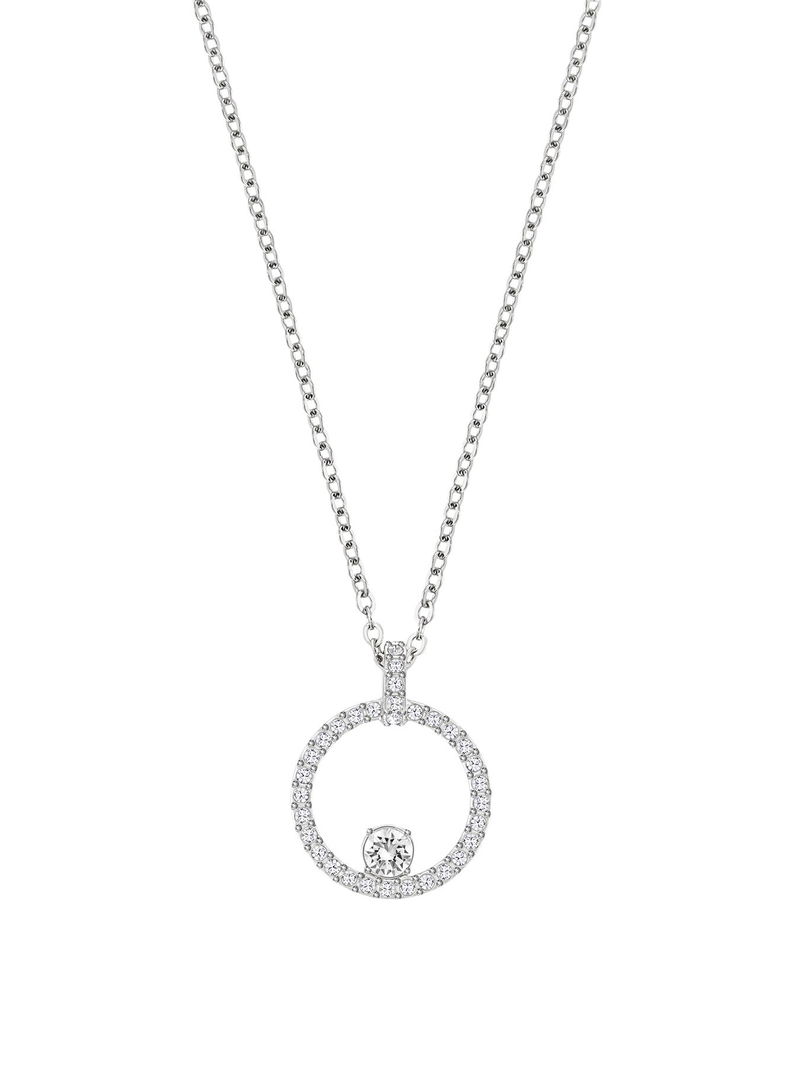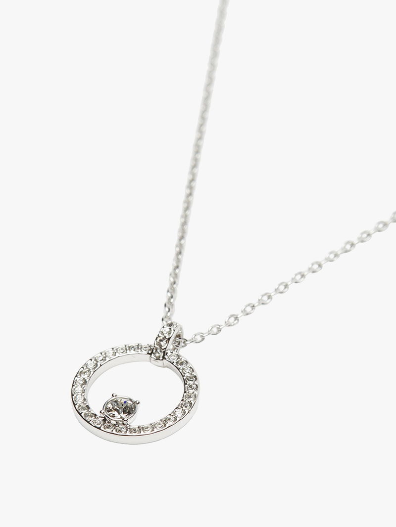 A modern take on the classic circle pendant, this rhodium plated piece features a central pavé ring of clear Swarovski Zirconia, with two larger prong-set Swarovski Zirconia holding it in place.