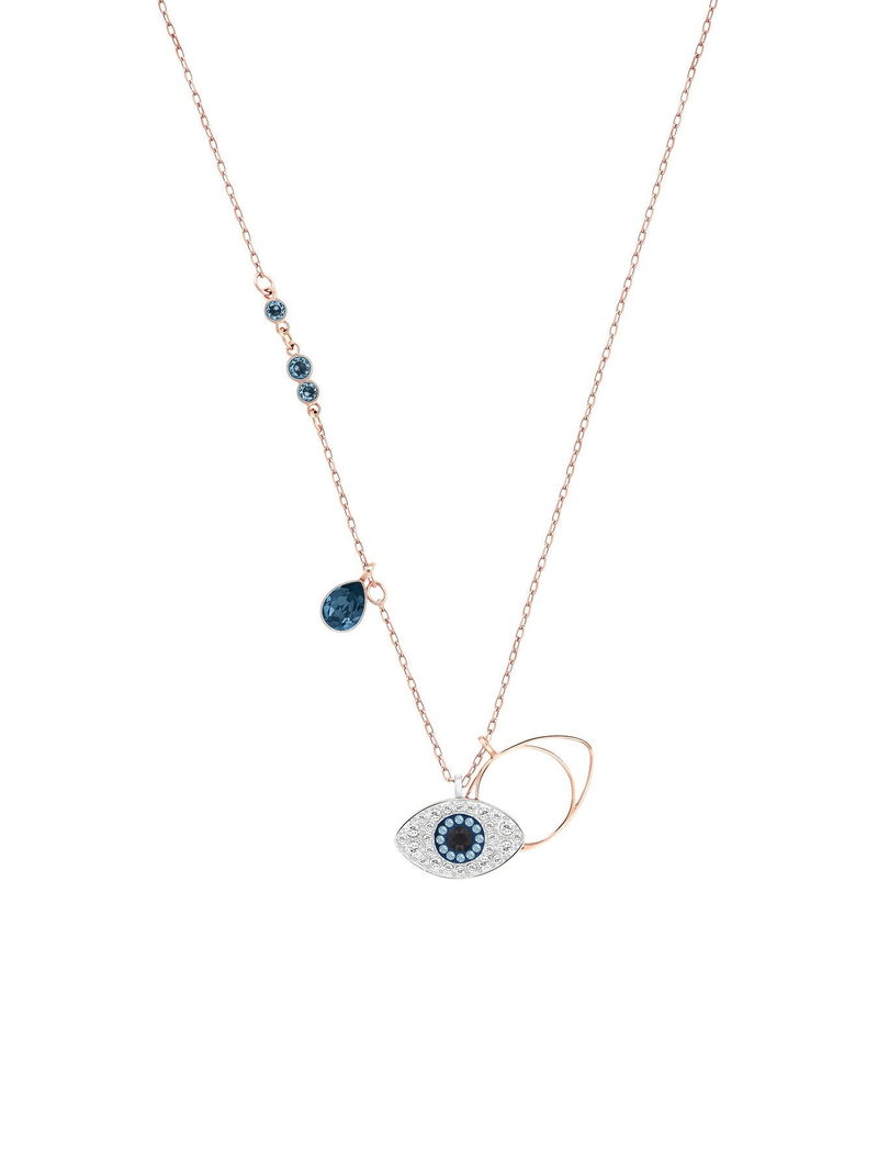 The mixed-plated Duo Pendant Evil Eye adds a mystic touch to any look. It features one eye motif in blue, black, and clear crystal pavé and one in rose gold-plated metal. The pendant comes on a rose gold-plated chain embellished with dark blue crystals.