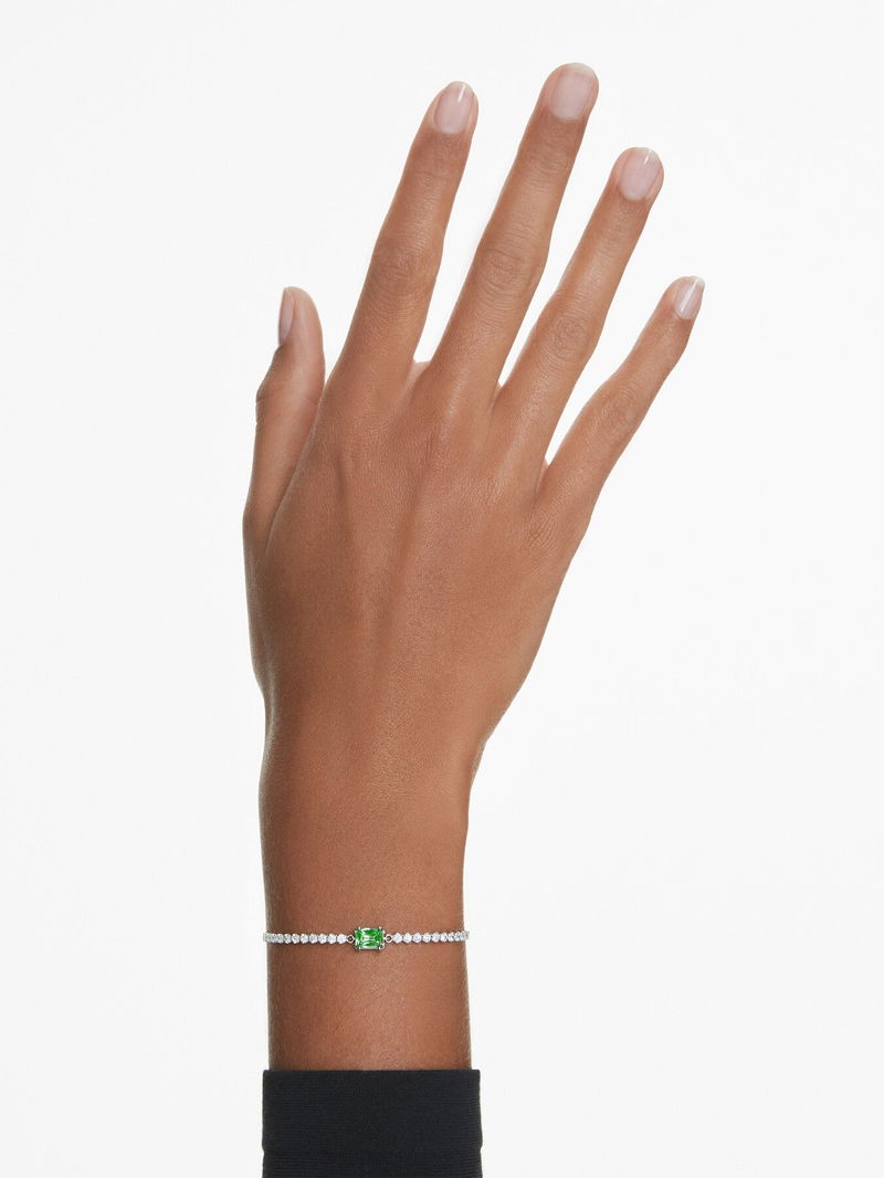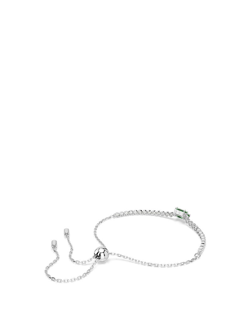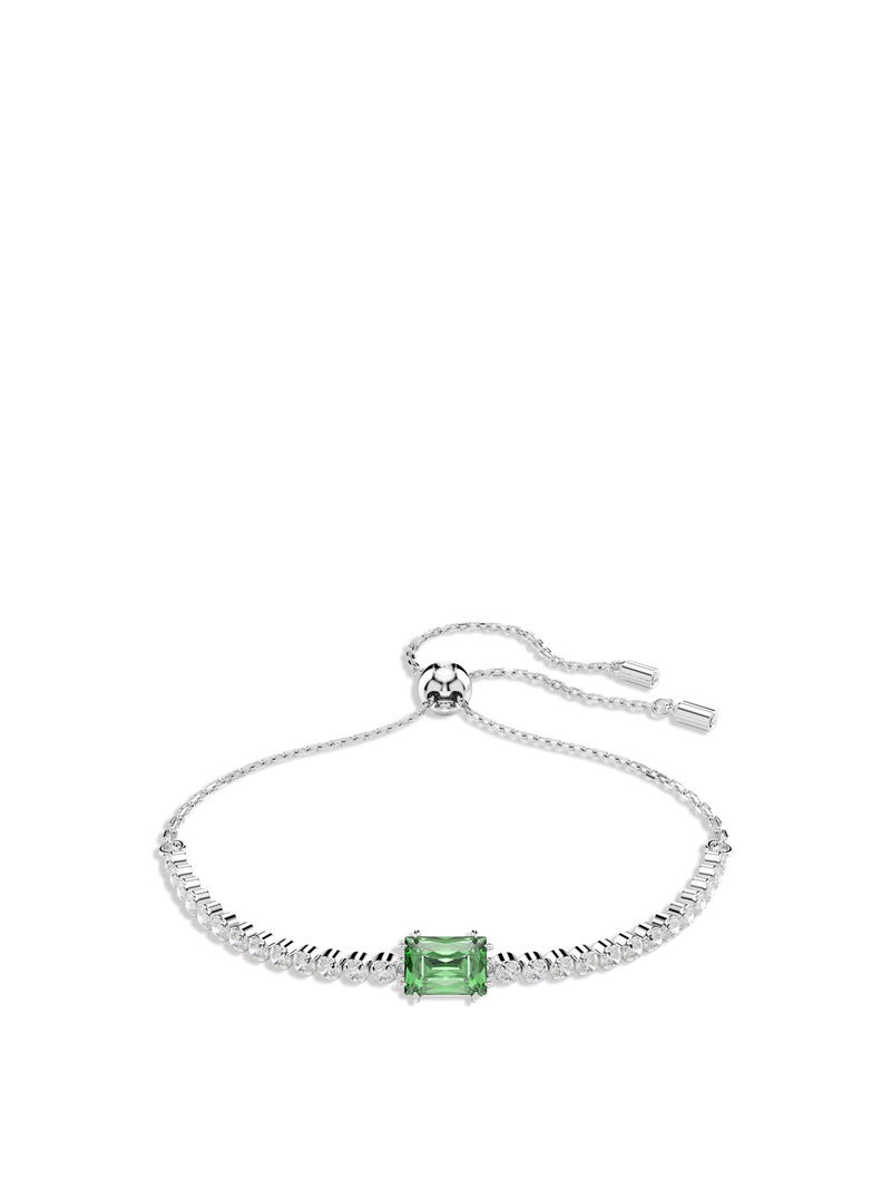Adding a touch of radiance to any look, this classic tennis bracelet combines clear Swarovski Zirconia with a pop of colour. Fastened with a sliding closure, the rhodium plated jewellery features a uniform row of clear Swarovski Zirconia and is accented with a baguette-cut green Swarovski Zirconia at its centre. A vibrant twist on a timeless style.