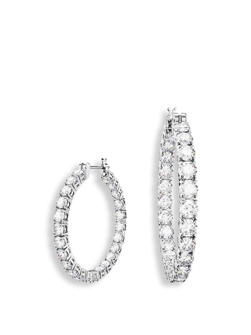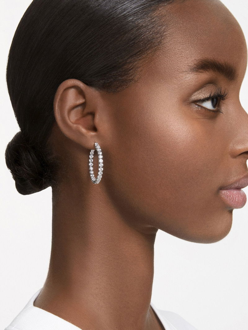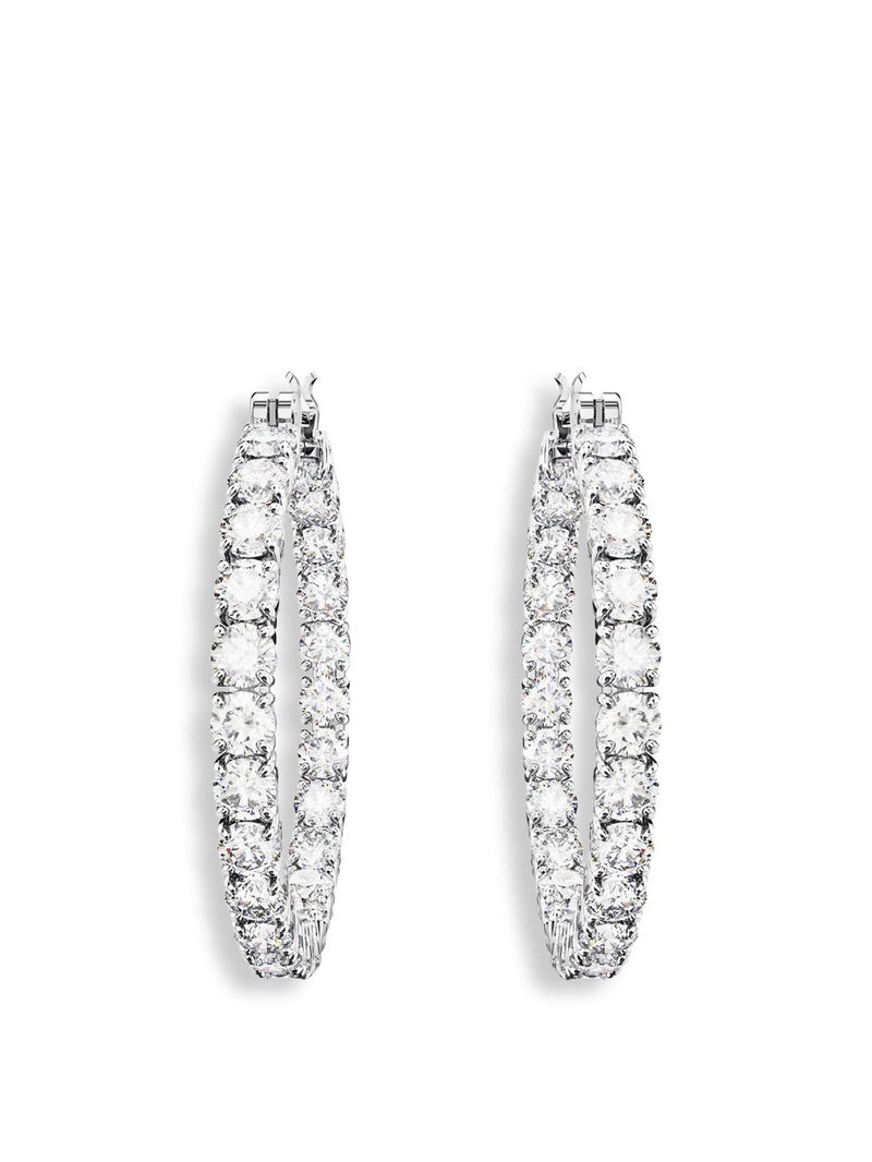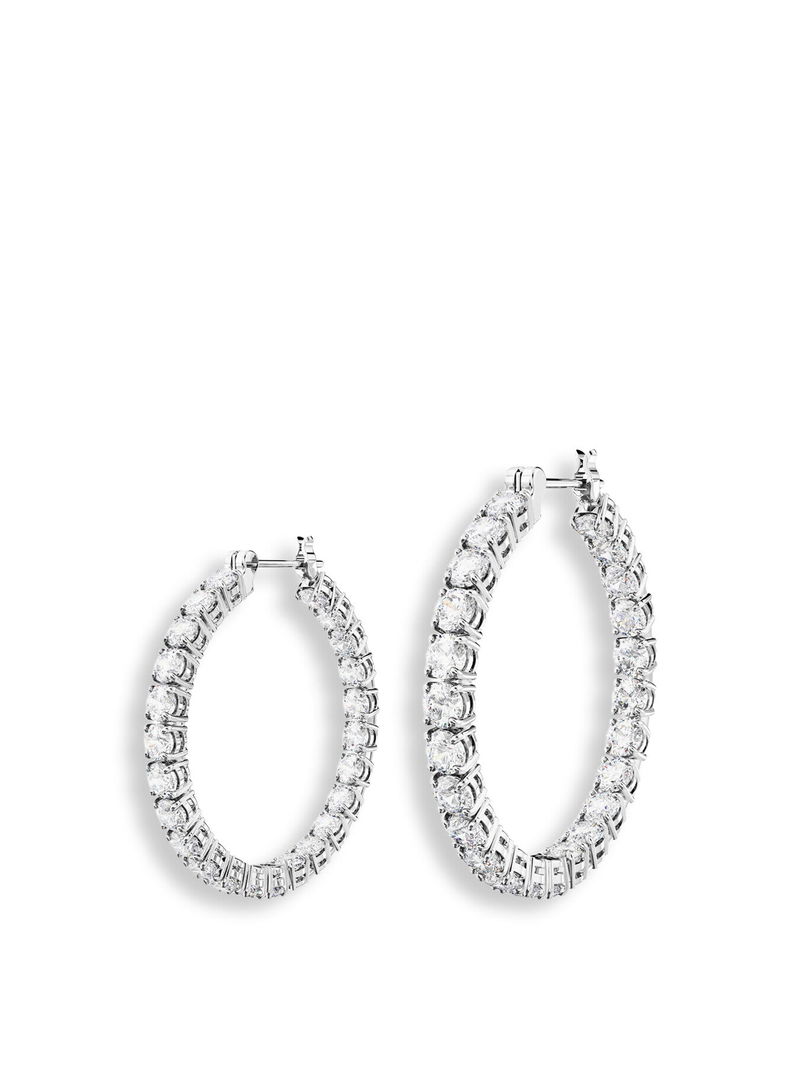 Simple, yet paved with exquisite colour, these Matrix hoop earrings are an essential addition to your jewellery collection. The perfect circle of round blue stones is set in rhodium plating for a fine combination of cool tones.