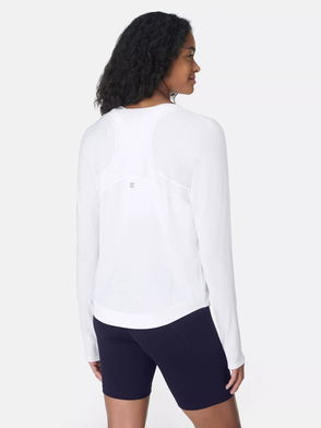 All-in-one from Sweaty Betty for studio workouts and everyday wear. The ultra-lightweight fabric is soft, sweat-wicking and stretchy. Slim fit with long sleeves and crew neck. Inner bra support with removable pads.