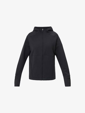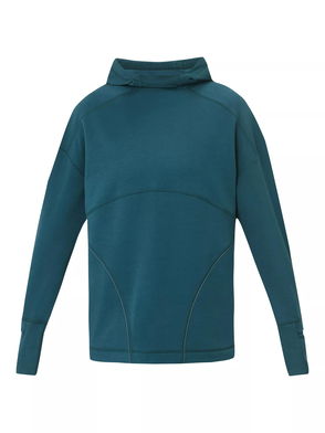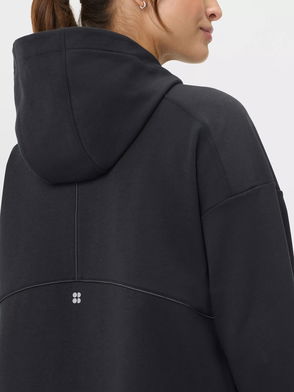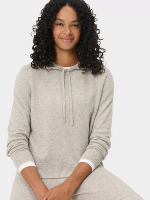 Soft and insulating Italian cotton-blend fleece with a loose fitting hoody with curved hem. New front pockets for essentials.