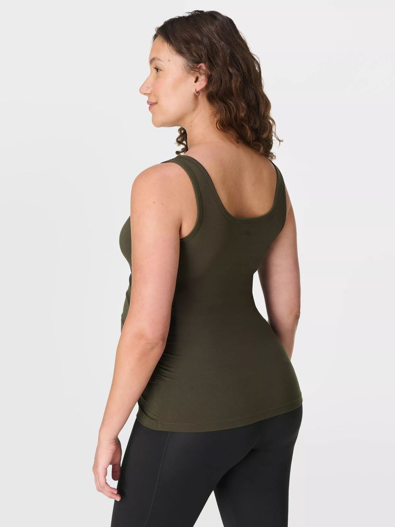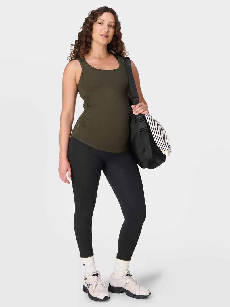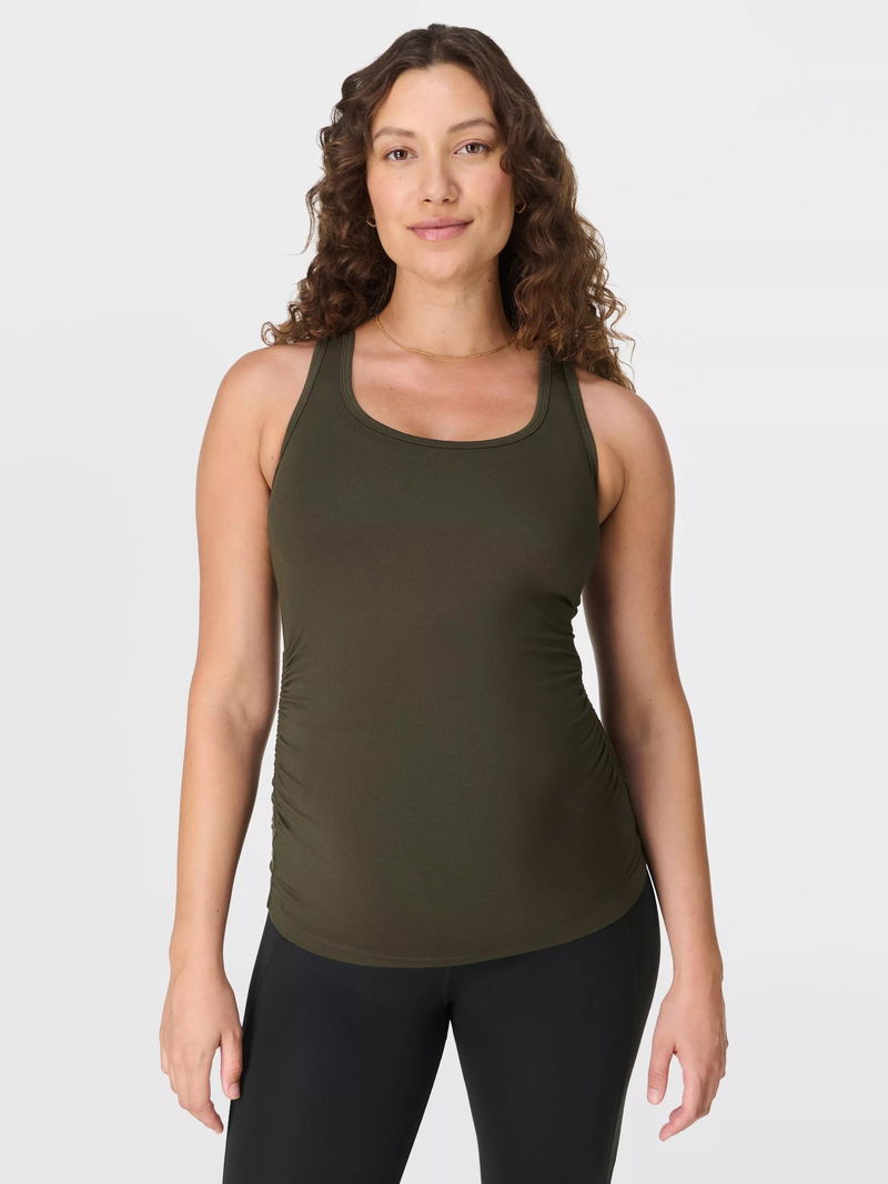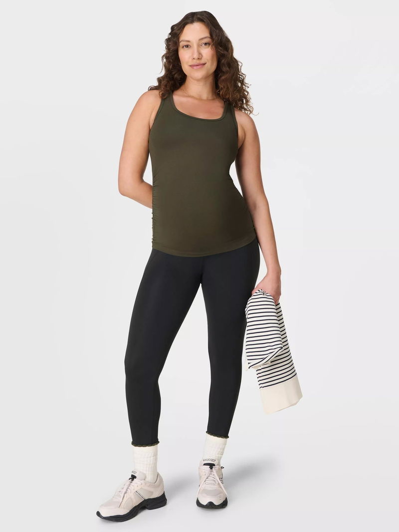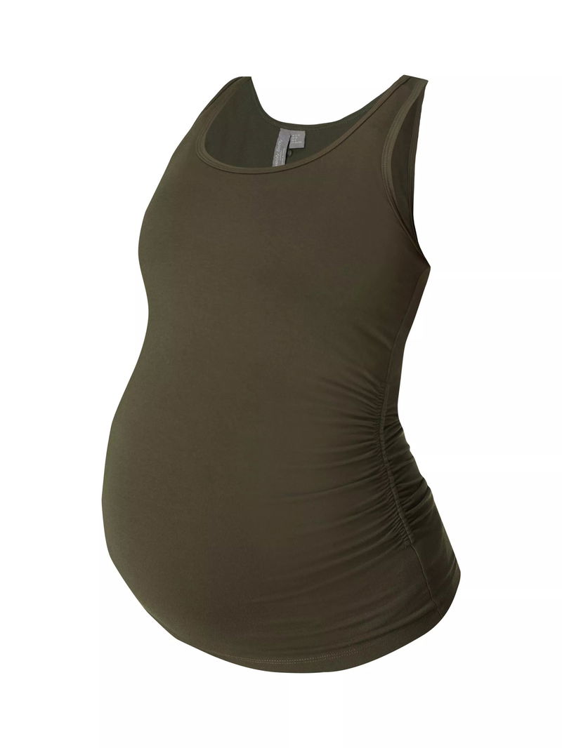 A soft everyday tank for pregnancy and postpartum. Made from a soft and stretchy modal blend. Elasticated ruched detailing at the sides, with a scoop neck and rounded hem.