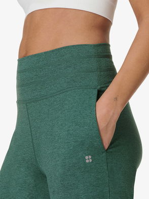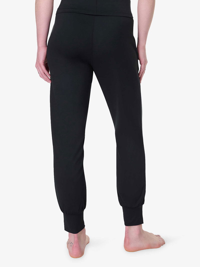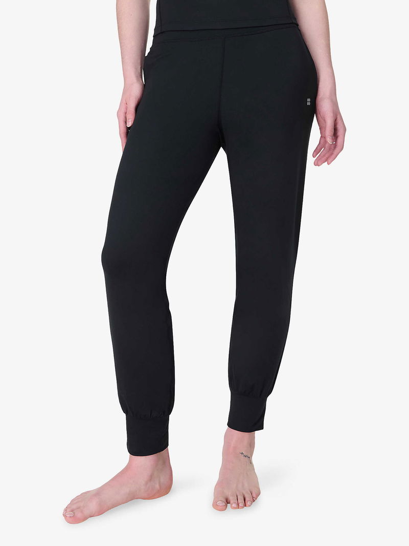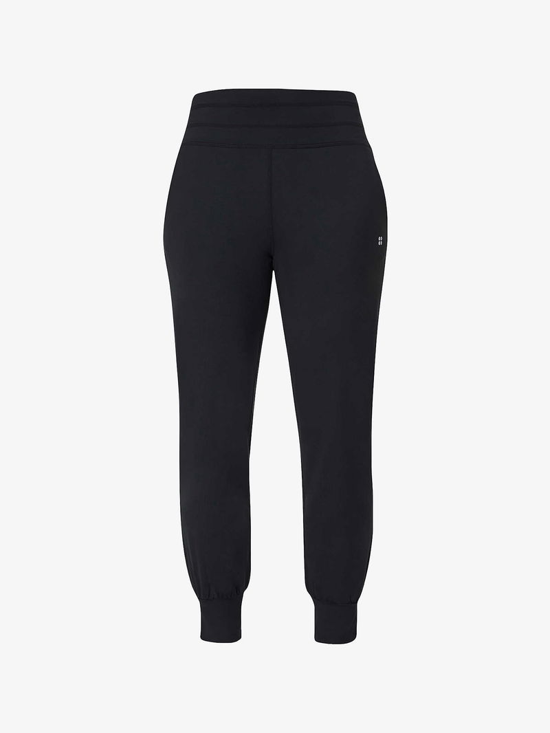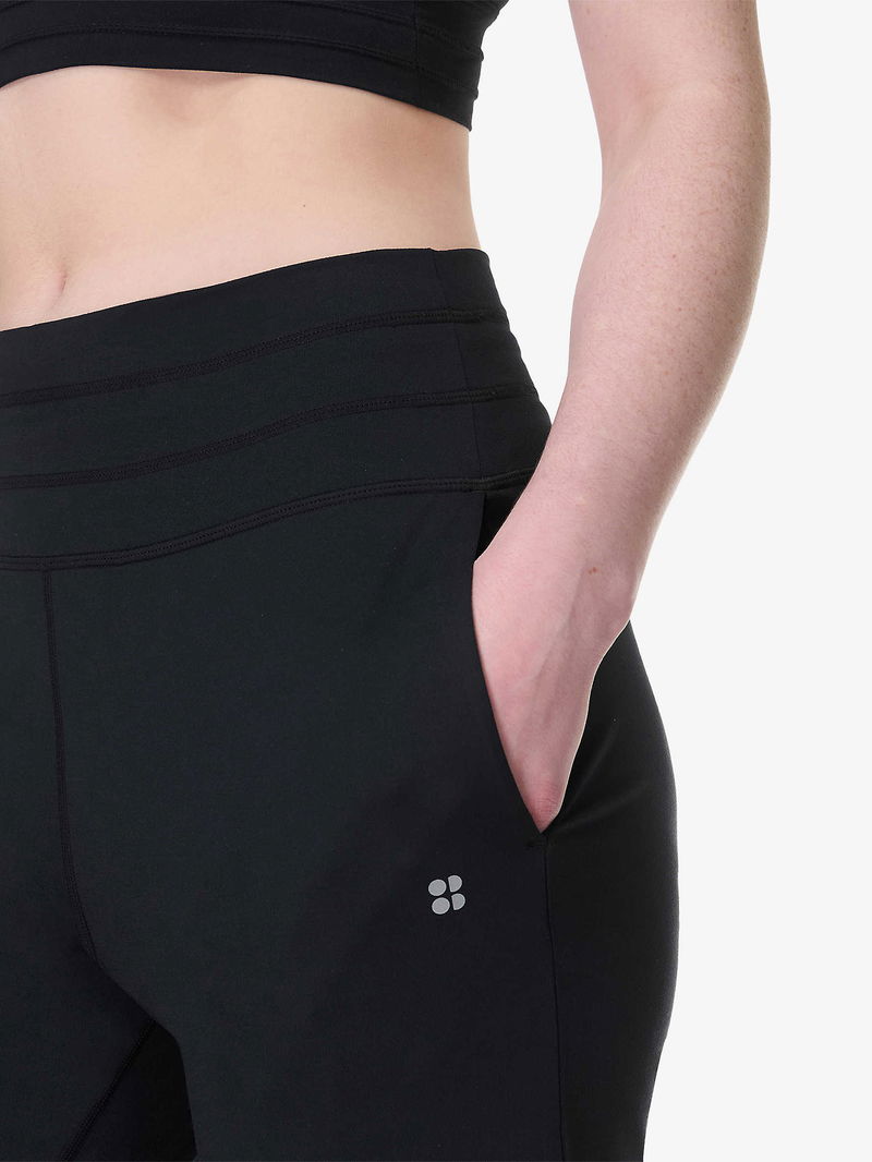 Sweaty Betty stretch-woven jogging bottoms. Relaxed fit, elasticated waistband, high rise, interior drawstrings, barrel leg, two side slip pockets, reflective logo print at side, sweat-wicking fabric.