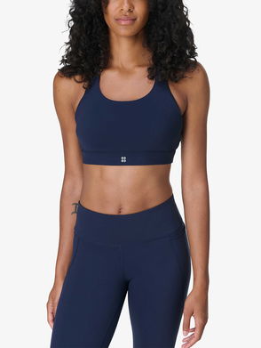 A sports bra with removed bust stitching for a cleaner, more modern aesthetic. Stretchy, sweat-wicking and quick-drying. Flattering scoop neck and looped back with an adjustable T-bar strap. Medium-impact design engineered for comfort and support with removable pads.