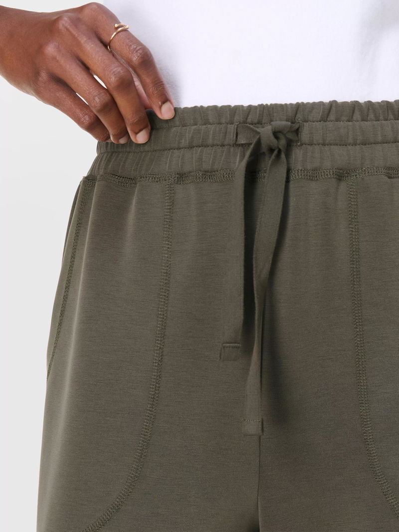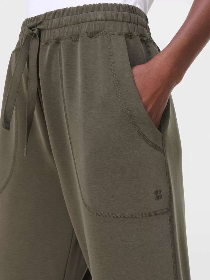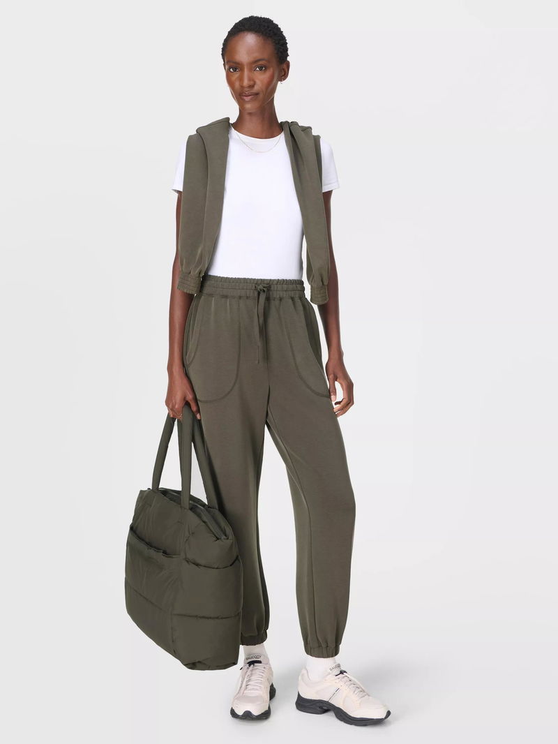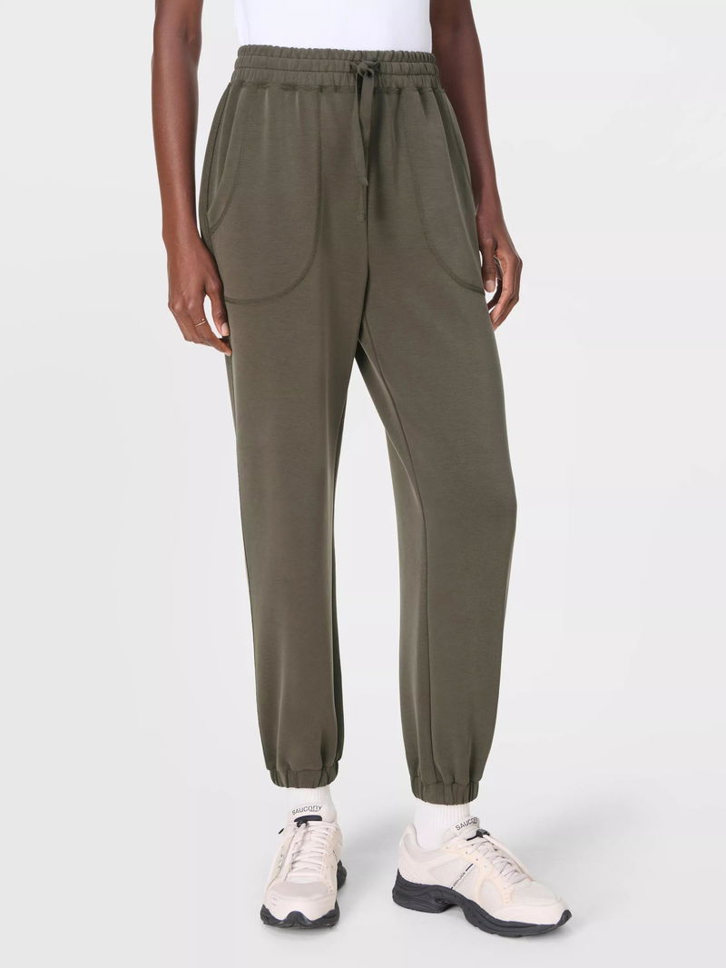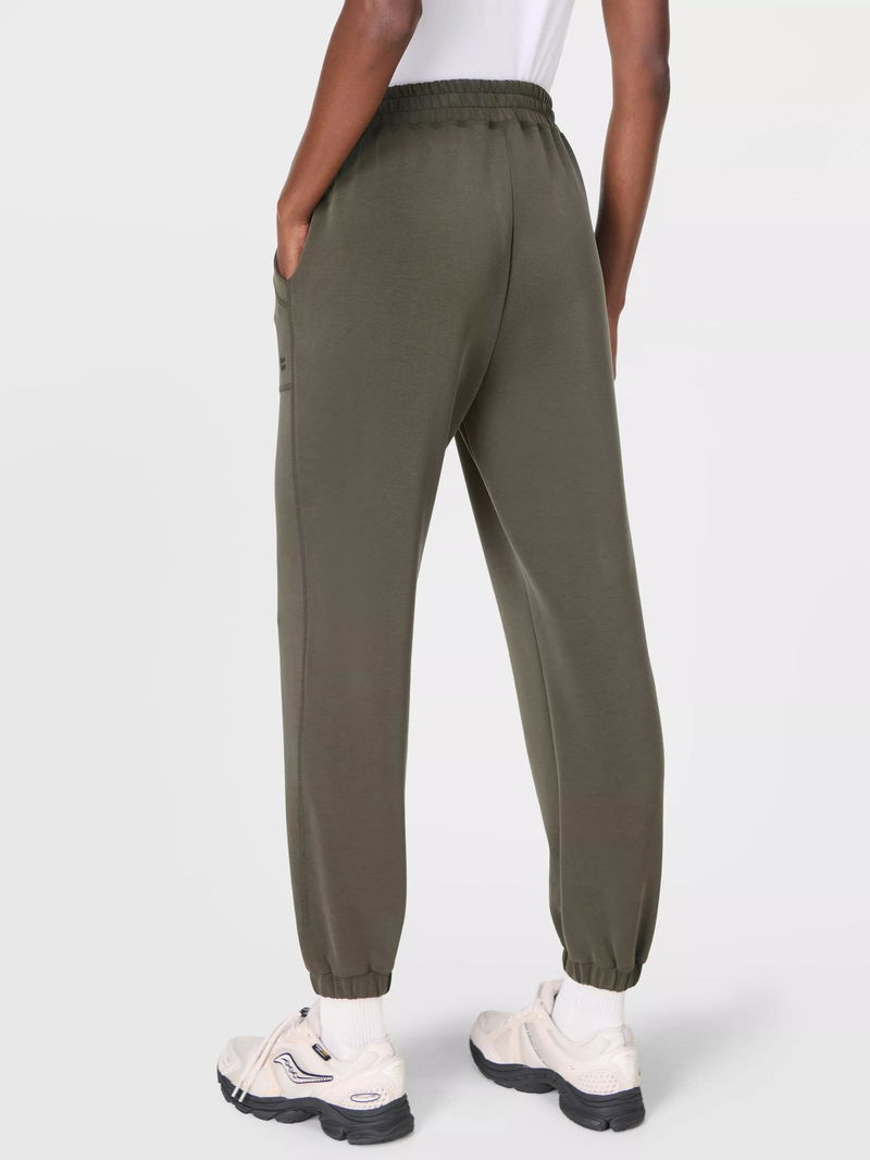 Stylish studio-to-street lifestyle trousers. Peachy soft fabric has a scuba-like feel. Elasticated waist with an adjustable tie and elasticated cuffs. Two deep side pockets with stitch detailing. Cut for a slim fit.