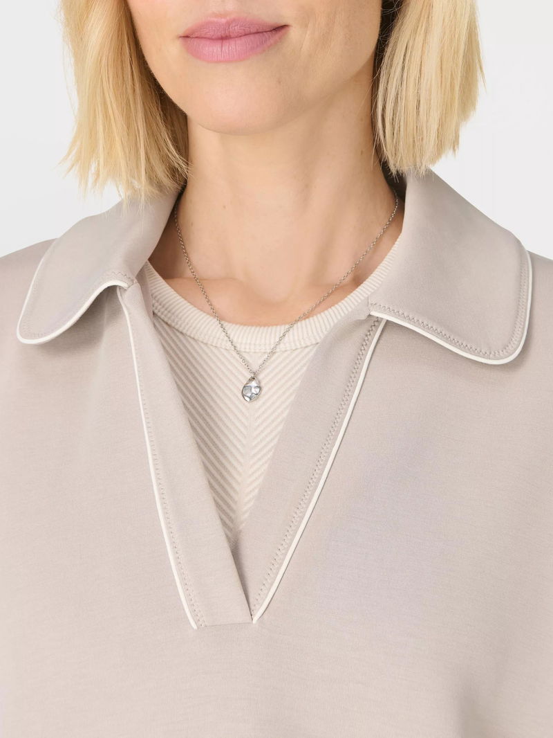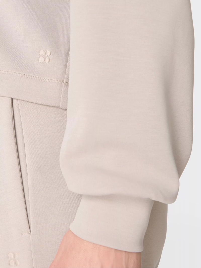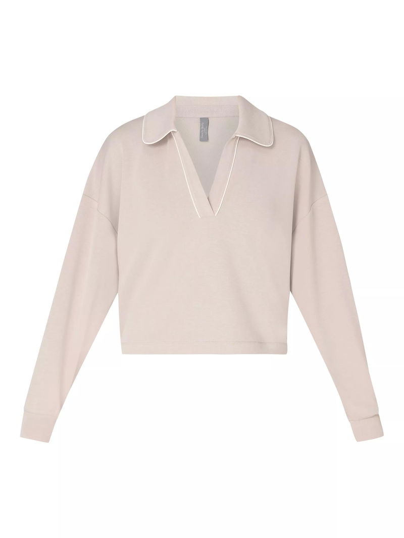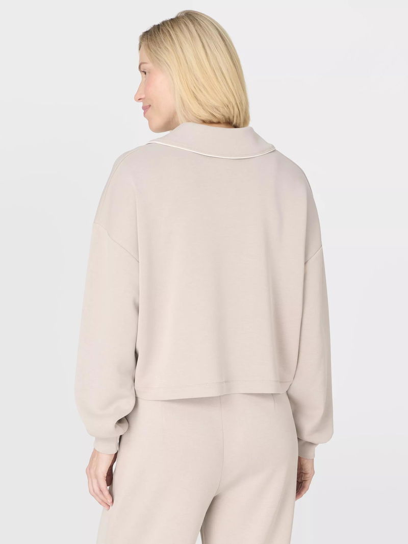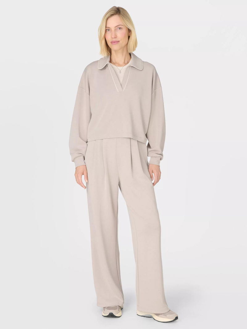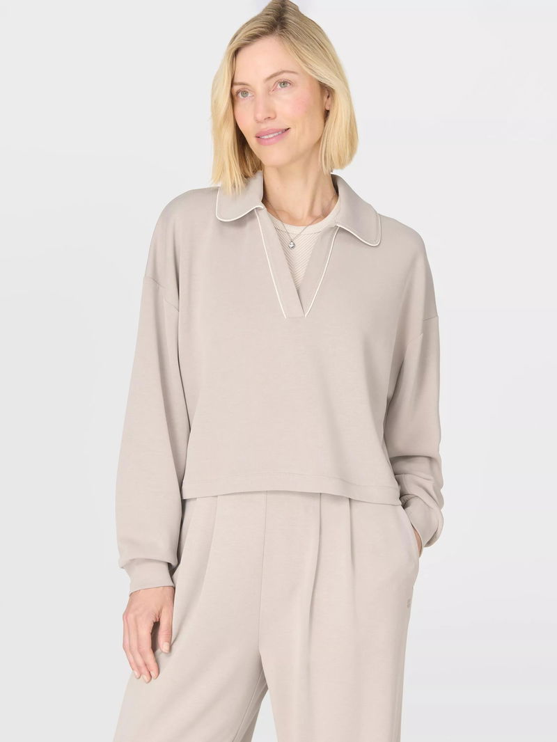 A new silhouette in the peachy soft Sand Wash collection. Peachy soft fabric has a lightweight, scuba-like feel. Cropped length with a Henley collar and dropped shoulder seams.