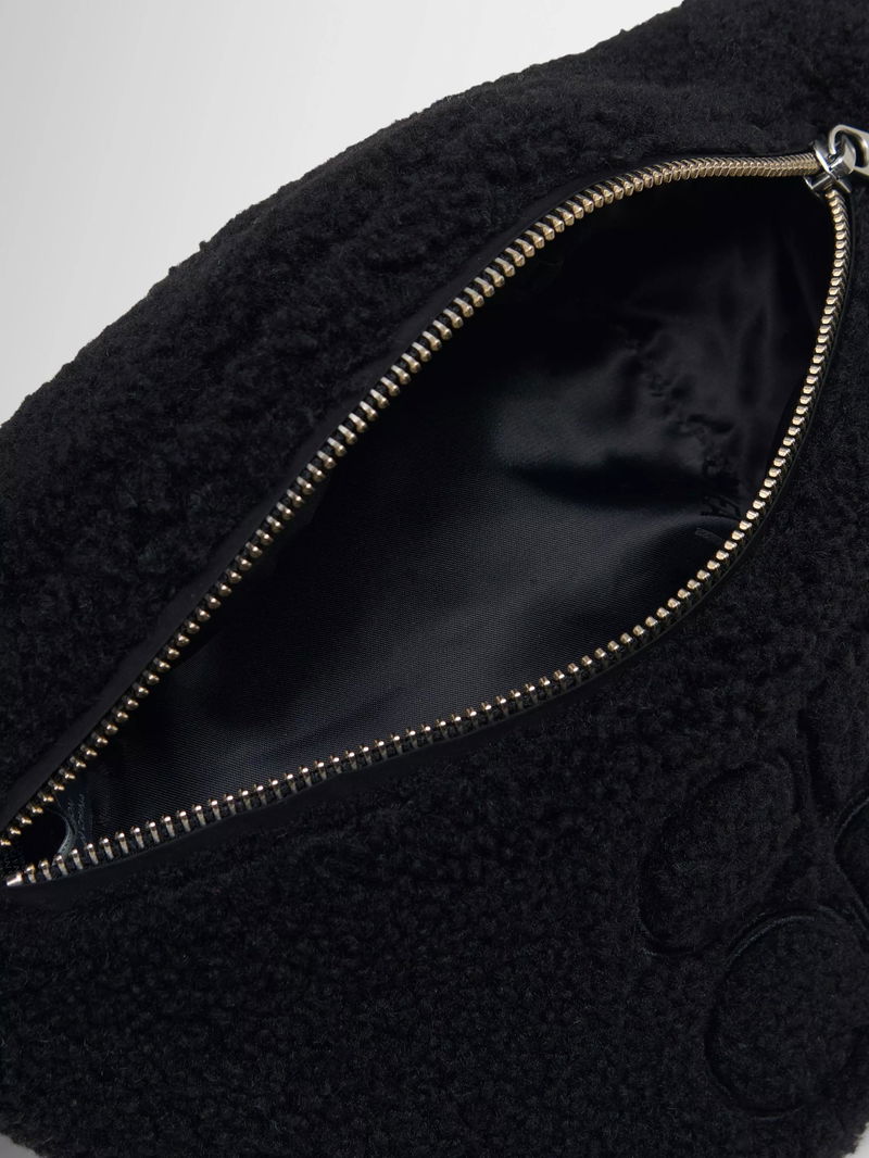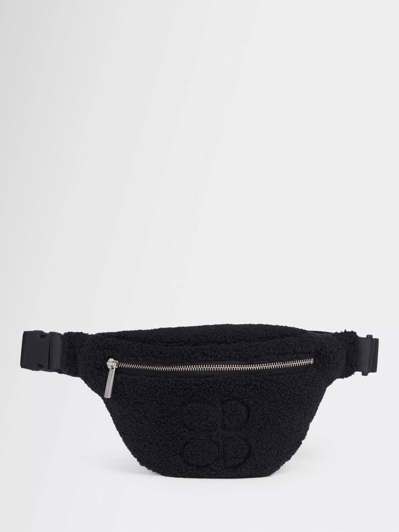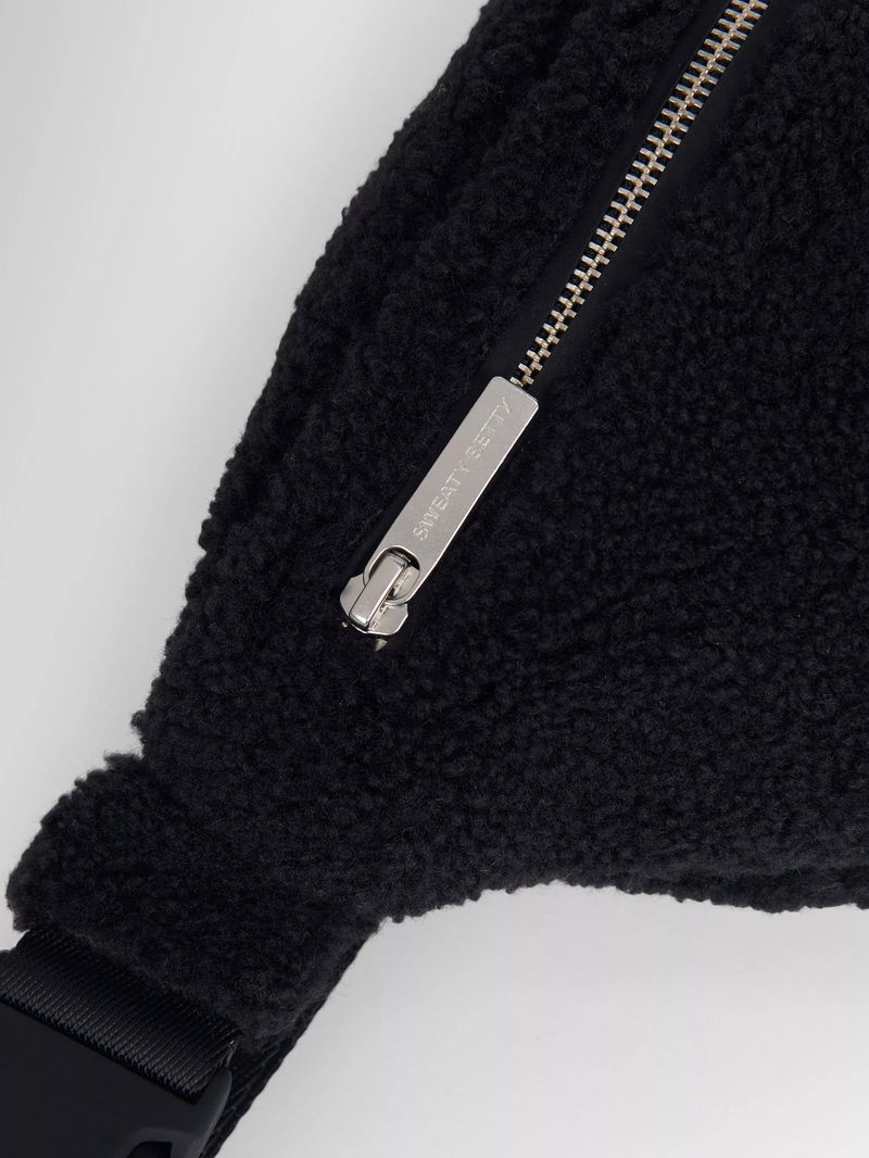 A bumbag in soft, sherpa-style fabric, with a magnetic snap fastening, adjustable strap and internal patch pocket.