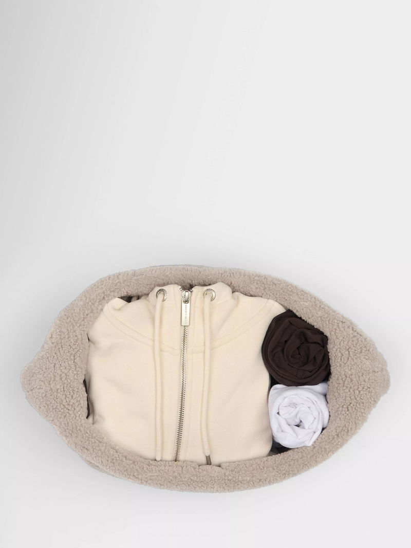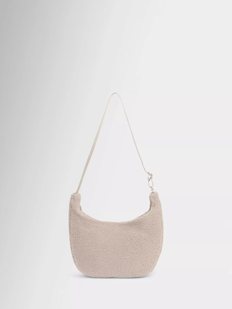 A sling bag in soft, sherpa-style fabric. Features a magnetic snap fastening, adjustable strap and an internal patch pocket.