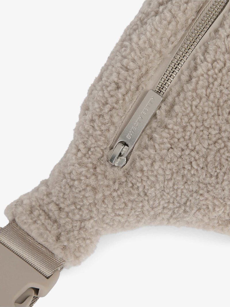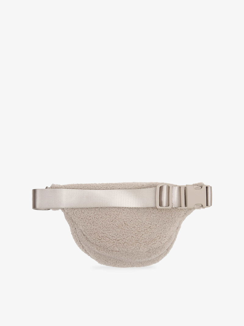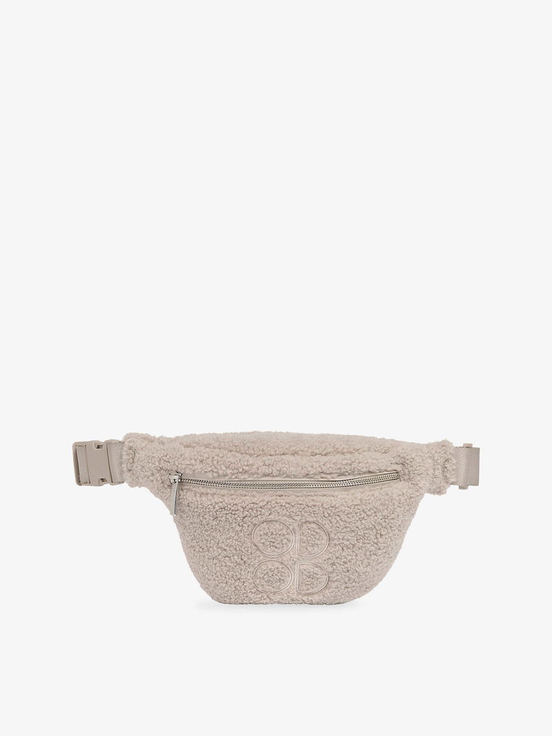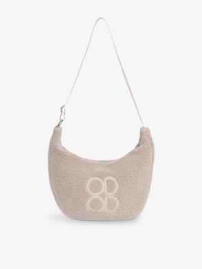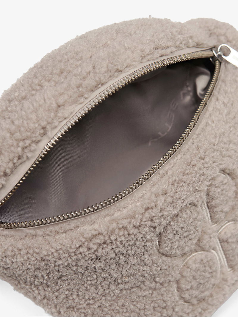 Soft curved shape, adjustable strap, embroidered logo at front, all-over faux shearling texture, one main compartment, one internal slip pocket.