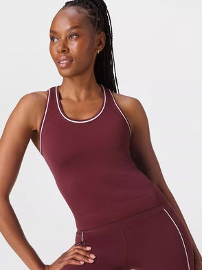 A supportive, seamless workout top. Made from a soft, sweat-wicking and breathable material, it features panelling to the front for shape and structure. Accented with a feminine crossed strap detailing to the back and a built-in bra shelf with removable padding.