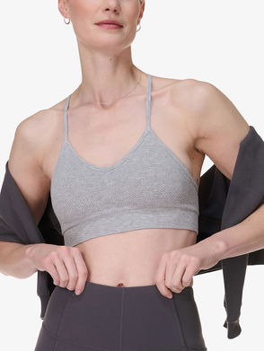 A low-impact bra with a flattering wrap design. The same sweat-wicking Super Soft fabric you love, now with a lighter weight and compression for increased flexibility. Ribbed wrap detail with scoop neck. Crossover back with keyhole cut-out. Features removable pads.
