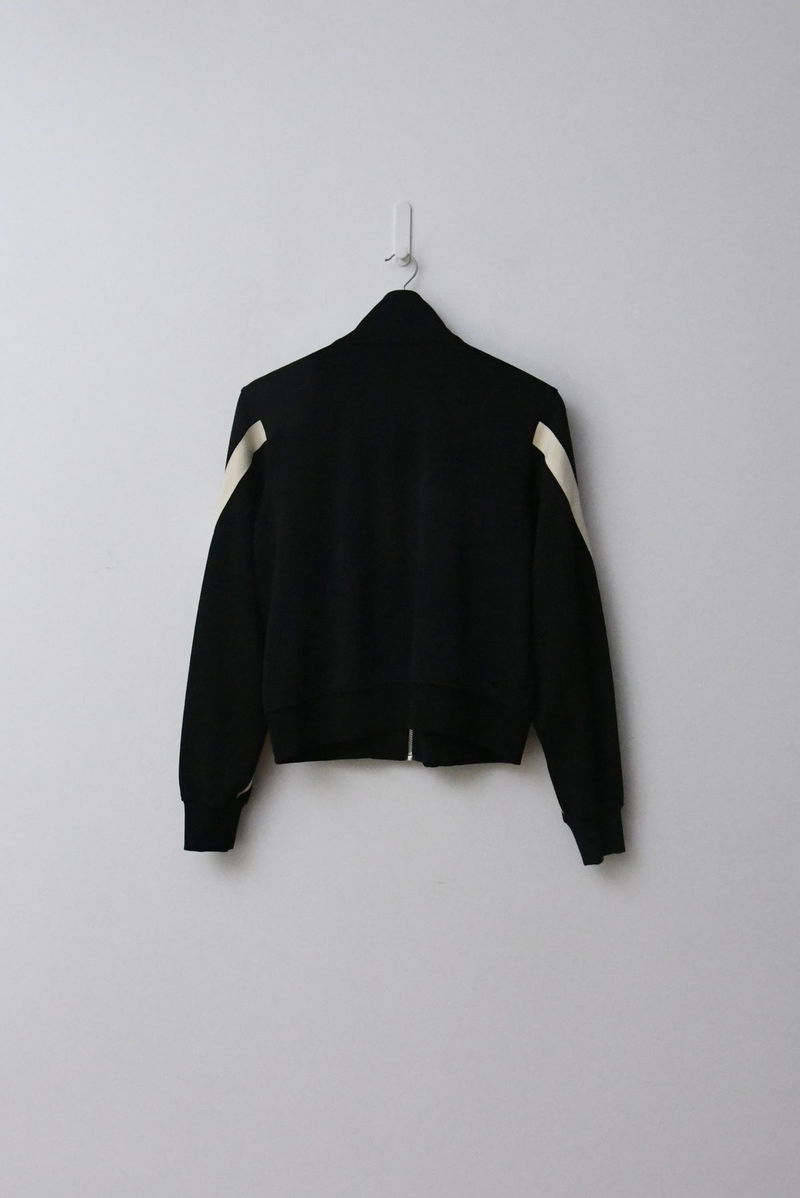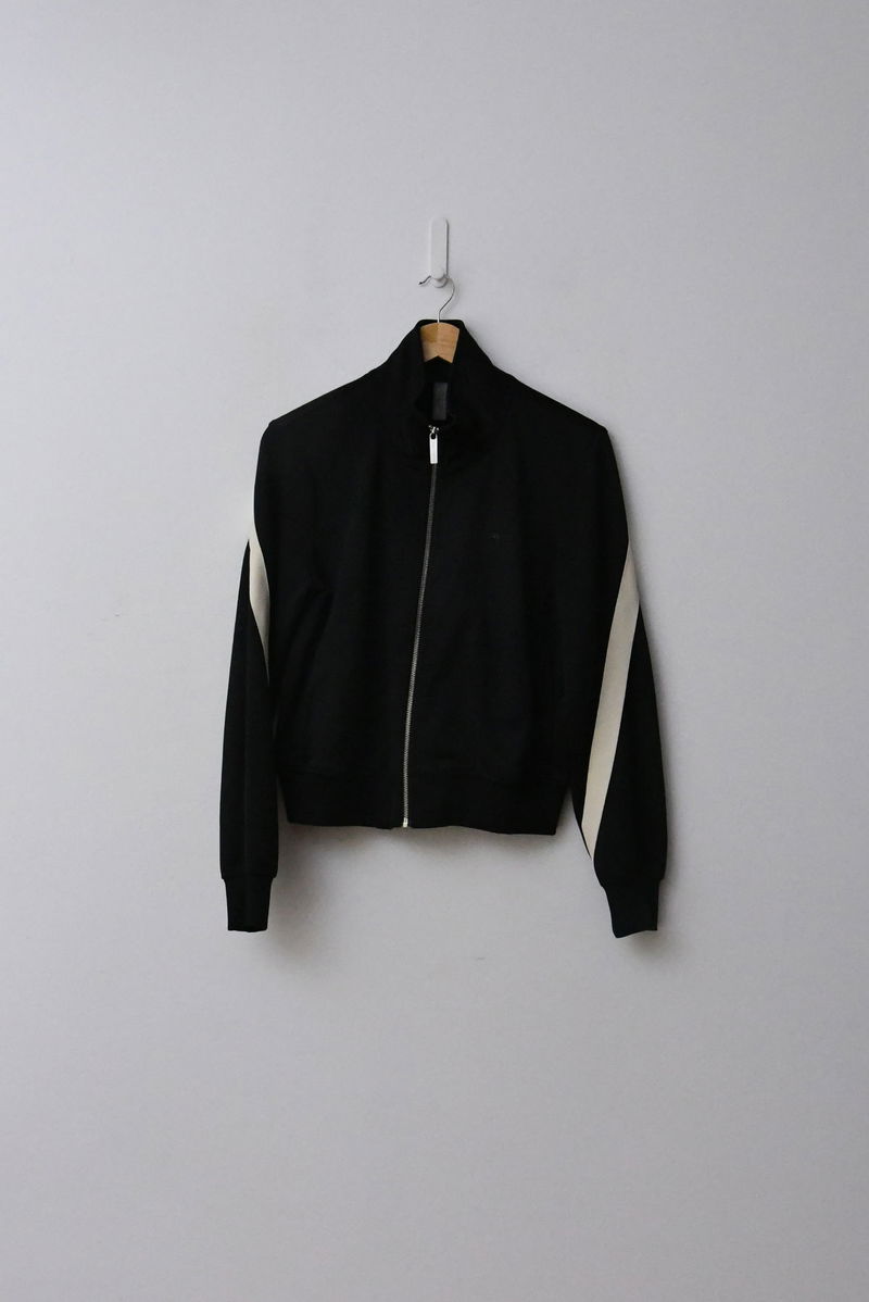 An elevated track top for easy and versatile styling. Lightweight, 55% recycled tricot fabric. Designed with a funnel neck, sporty silhouette with a double zip at the front, and striped detailing wrapped around the arms. Side pockets, ribbed cuffs and hem. Made using recycled materials, helping us to reduce the impact on the planet.
