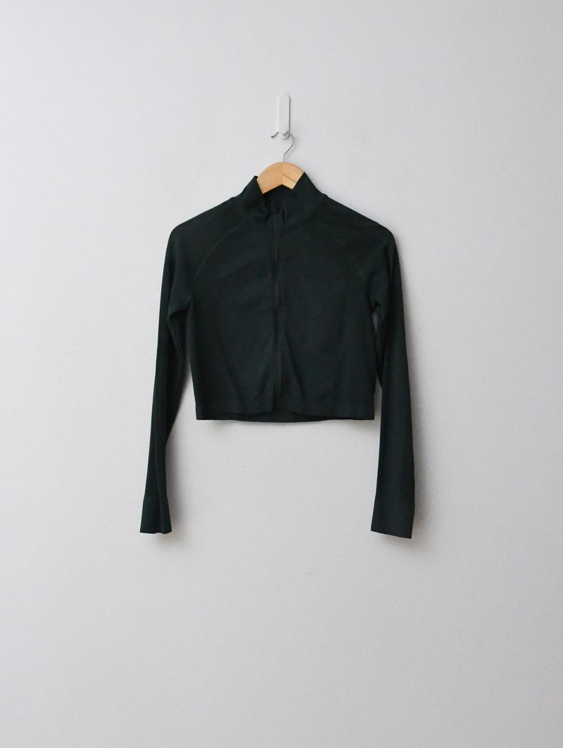 Fabric is lightweight, high-stretch and sweat-wicking. Seamless with a slim, cropped fit and high neck. Full centre zip and long sleeves with thumbholes to keep your wrist warm Features branded internal placket detail.