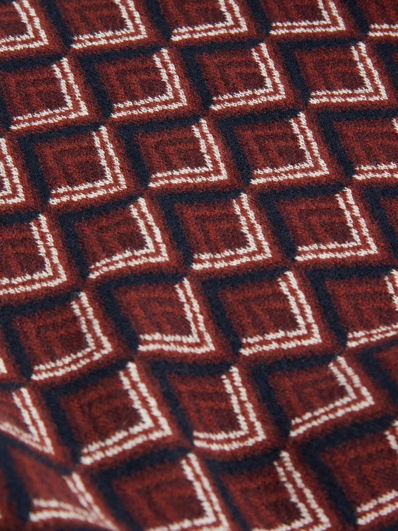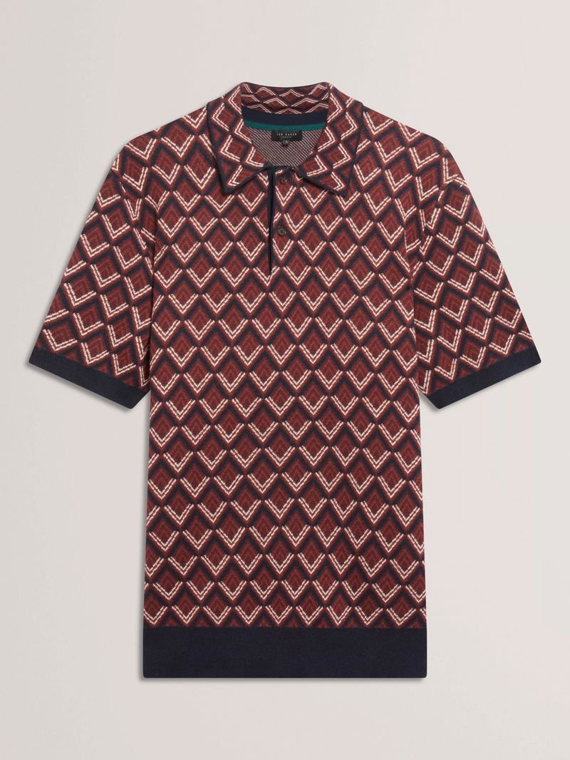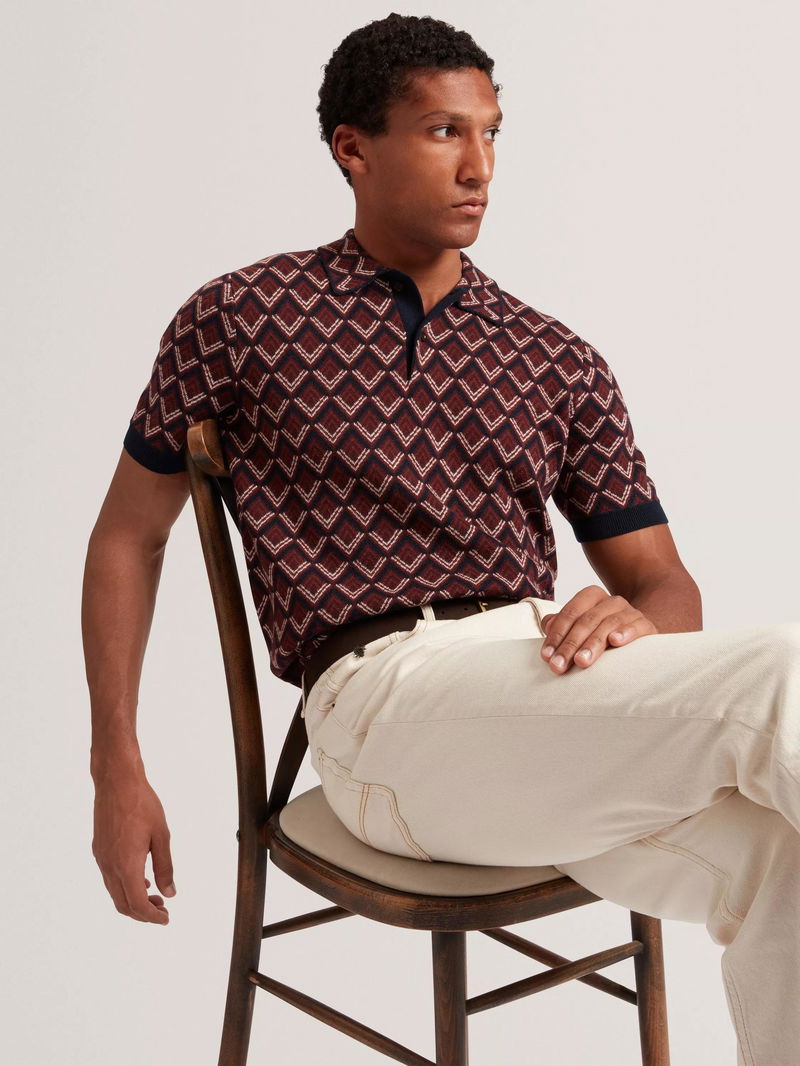 Bring a smart edge to your outfit with this fine-knit jersey cardigan. Its geometric pattern adds interest, while the collared design delivers both comfort and confidence for your day. A clever piece for layering in any setting.