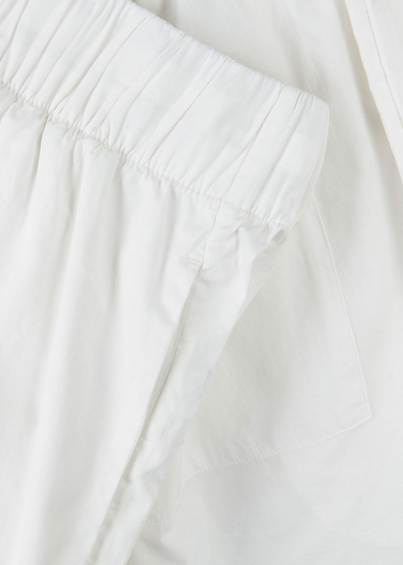 Tekla poplin pyjama shorts. Elasticated drawstring waist side slip pockets two back patch pockets. Pull on.