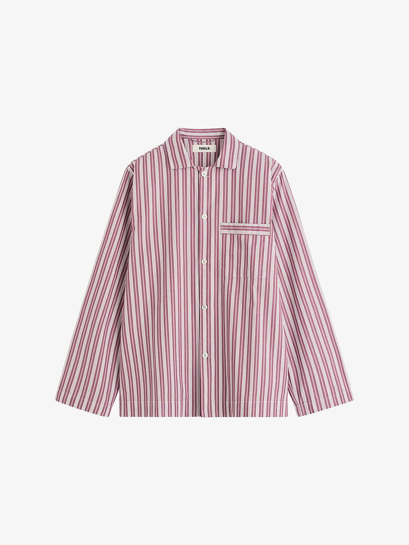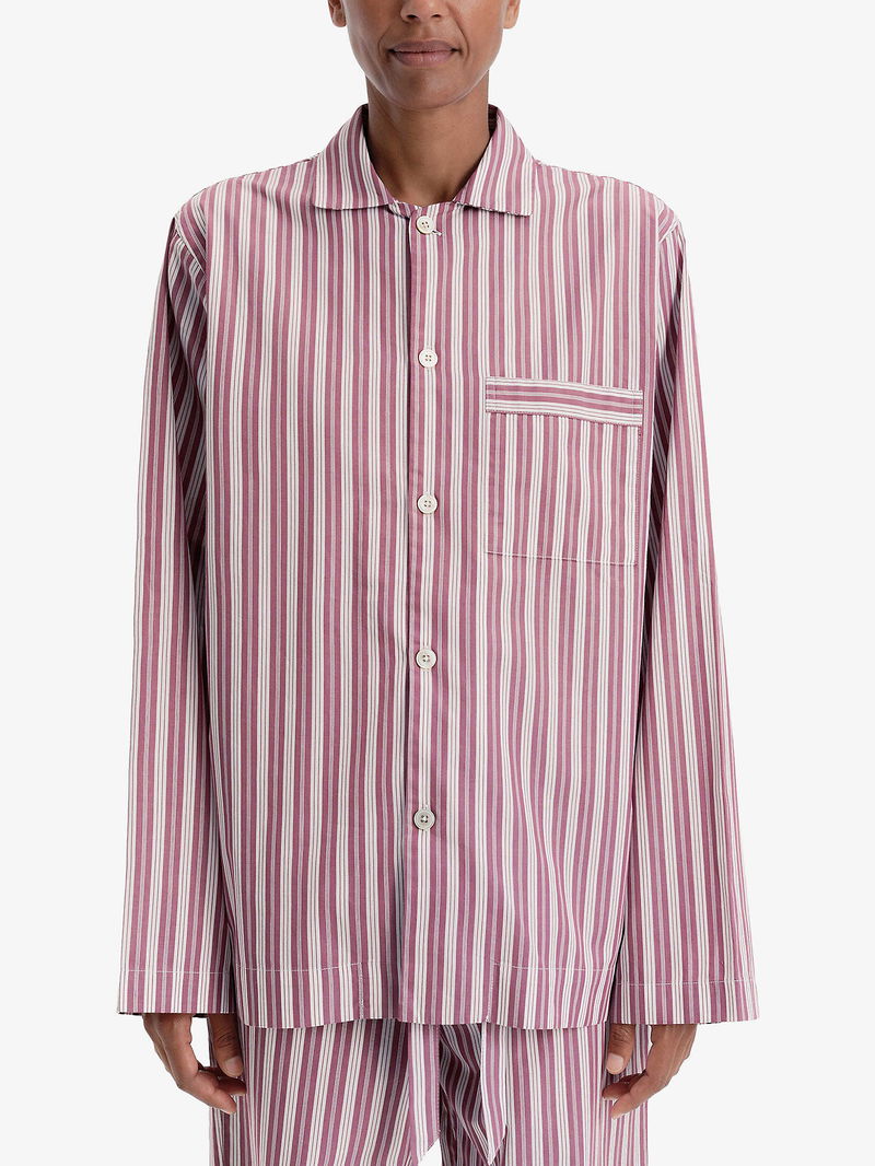 Tekla cotton-poplin pyjama shirt. Exposed button fastenings at front. Relaxed fit, pointed collar, long sleeves, one chest patch pocket, pearlescent buttons, all-over stripe print.