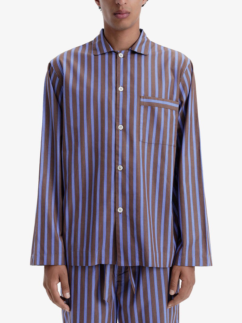 Tekla cotton-poplin pyjama shirt. Exposed button fastenings at front. Relaxed fit, pointed collar, long sleeves, one chest patch pocket, pearlescent buttons, all-over stripe print.