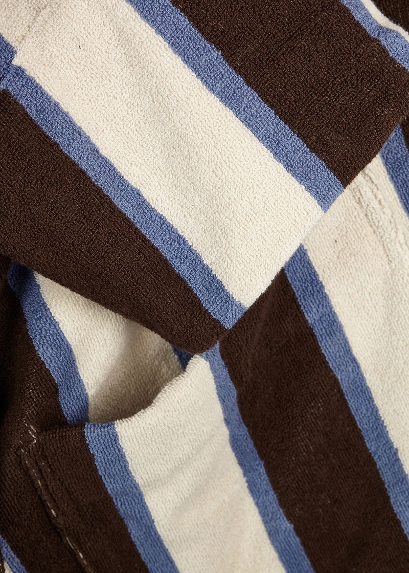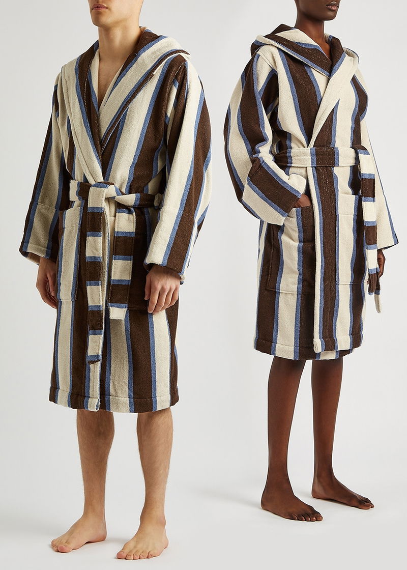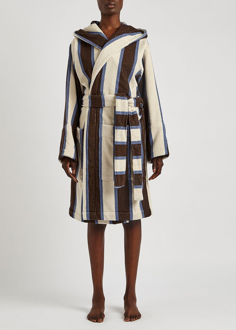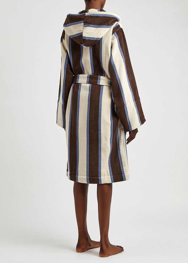 Tekla brown cream and blue terry cotton robe. Striped hood dropped shoulders two front patch pockets detachable belt belt loops. Slips on.