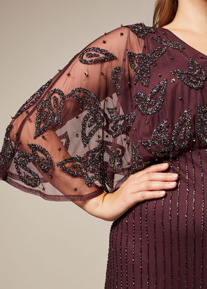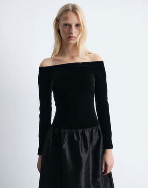 Off Shoulder Maxi Dress With Peplum Hem In Black Mixed Velvet And Satin Fabric