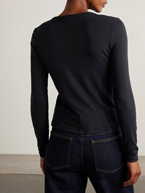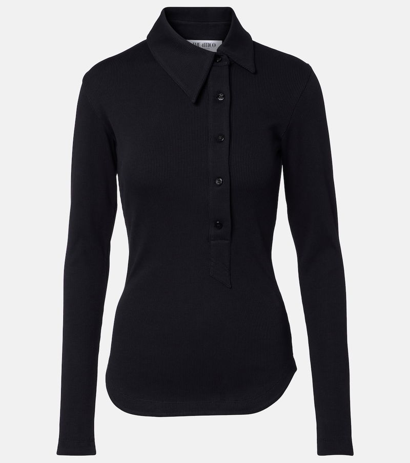 Jersey Rib Polo Top With Zip Collar And 3/4 Length Sleeves In Black