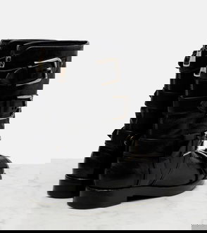 Give your looks a rock-style edge with these comfortable, black leather boots. The notched soles and oversized, shin guard-style tongue give these a modern biker style, and the metallic buckles give them a grungy feel. This seasons definitive 'It' shoes, try them with jeans, or wear them with a dress to bring out your rebellious side.