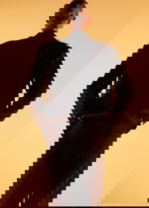 To set it apart and showcase our expertise, this black formal jacket has an impeccable tailored cut. It’s made using the fine warm wool from our menswear range, enhanced by a tone-on-tone button fastening, large notched lapels and piped pockets at the sides. Darts and shoulder pads give the loose-fitting piece some structure. Give your business look a modern revamp by teaming this women’s jacket with flared pants and loafers.