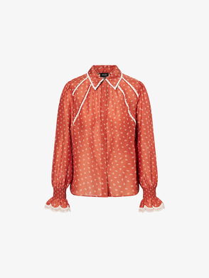 Classic orange shirt with floral print Description This smart shirt for women will take you right back to the 1970s with its bright printed motif all over. Thanks to its classic style, complete with a spread collar and long sleeves with buttoned cuffs, it brings out all kinds of body shapes. A signature motif this season, the small flowers in various shades of orange create a vibrant array of colours all over. Opt for a retro head-to-toe look by teaming this shirt with a short brown leather skirt.