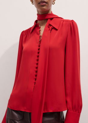 This smart silk shirt boasts one of the soft, charming and delicate shades at the heart of our collection. The light, bright purple color brings out the slightly satin-like texture of the sophisticated fabric used. This piece features some of the defining details of '70s pieces, including a wide spread collar, small pearly buttons and flared cuffs. Opt for a bold outfit by teaming this shirt with a short vinyl skirt and a pair of Mary Jane shoes.