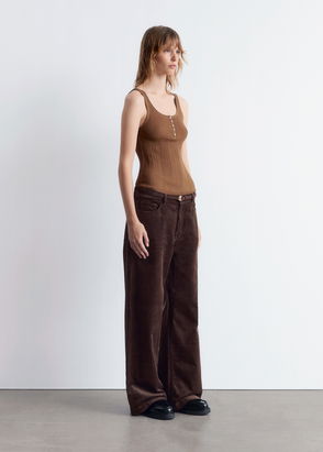 For a look that’s brimming with character, switch out your basic winter pants for these flared ecru pants. Masculine-feminine suits have been reworked in soft and slightly textured corduroy straight from the ‘70s. The material brings out your figure perfectly by accentuating the flared legs of the piece. Bring out the character of these velvet pants with a matching hooded sweatshirt, long winter coat and pair of boots.