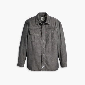 Subtly enhanced by its geometric detailing, this black denim shirt is inspired by classic pieces. Made from thick cotton canvas, it’s straight-cut, and has long sleeves, a button placket and a spread collar. The dark shade contrasts with the thin, graphic lines of white topstitching on the front. Wear this denim shirt over a white T-shirt, with grey urban trousers and biker boots.