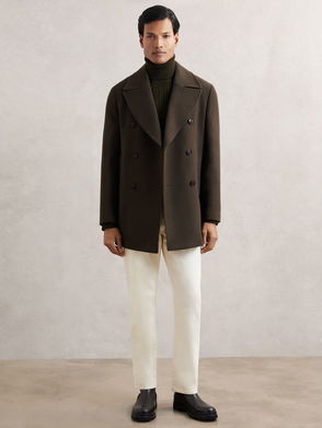 Perfect for winter, this green coat is a long, warm version of the iconic officer jacket. Directly inspired by military clothing, it’s double-breasted and fastens with silver buttons that stand out against the dark fabric. The flap pockets at the sides and small notched collar provide structure. Bring out the unique style of this coat by wearing it with a red mohair sweater, houndstooth trousers and leather moccasins.