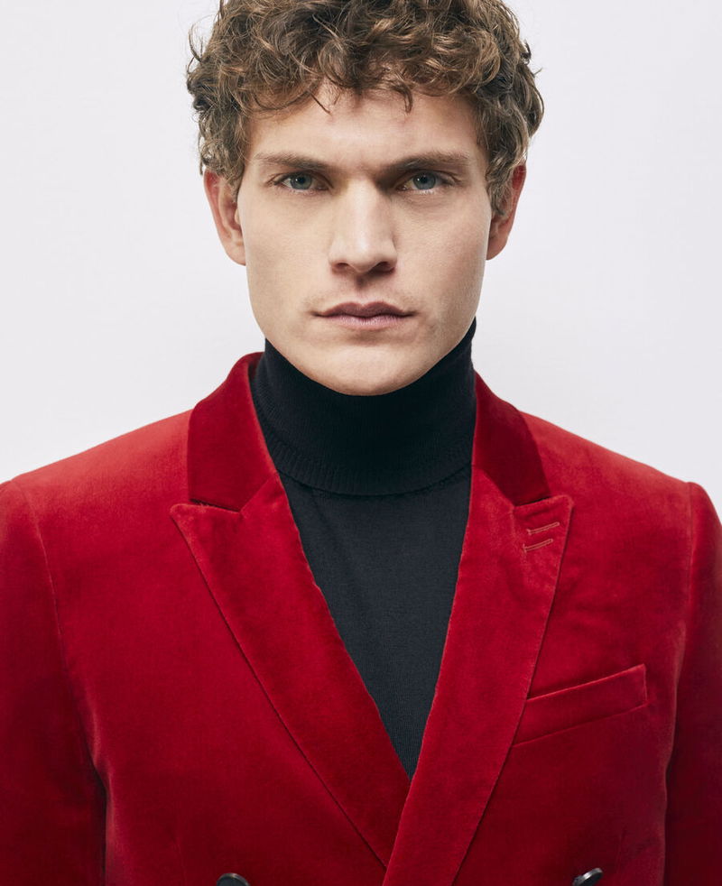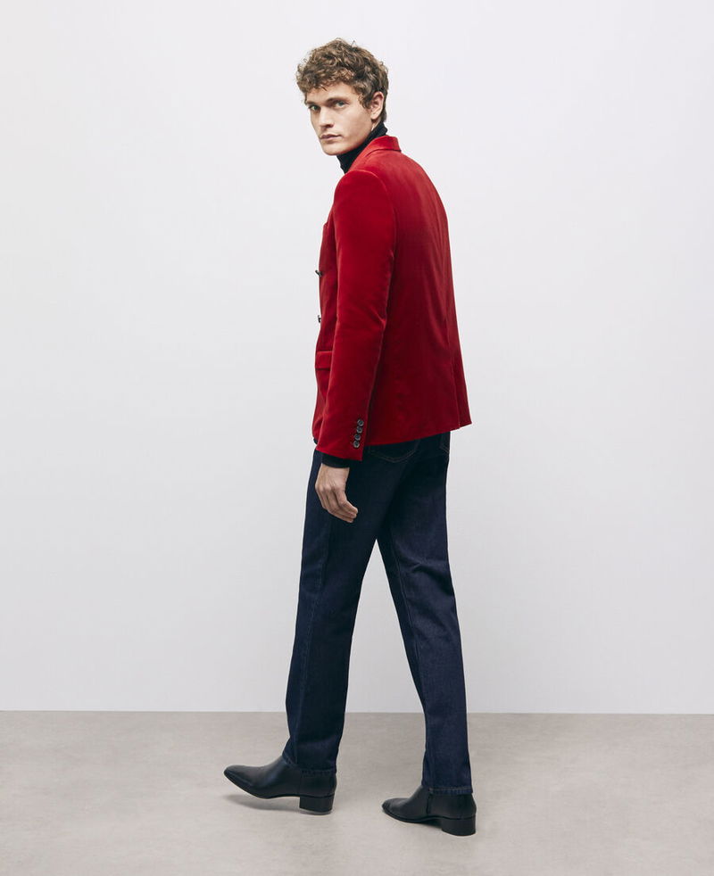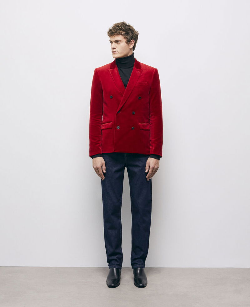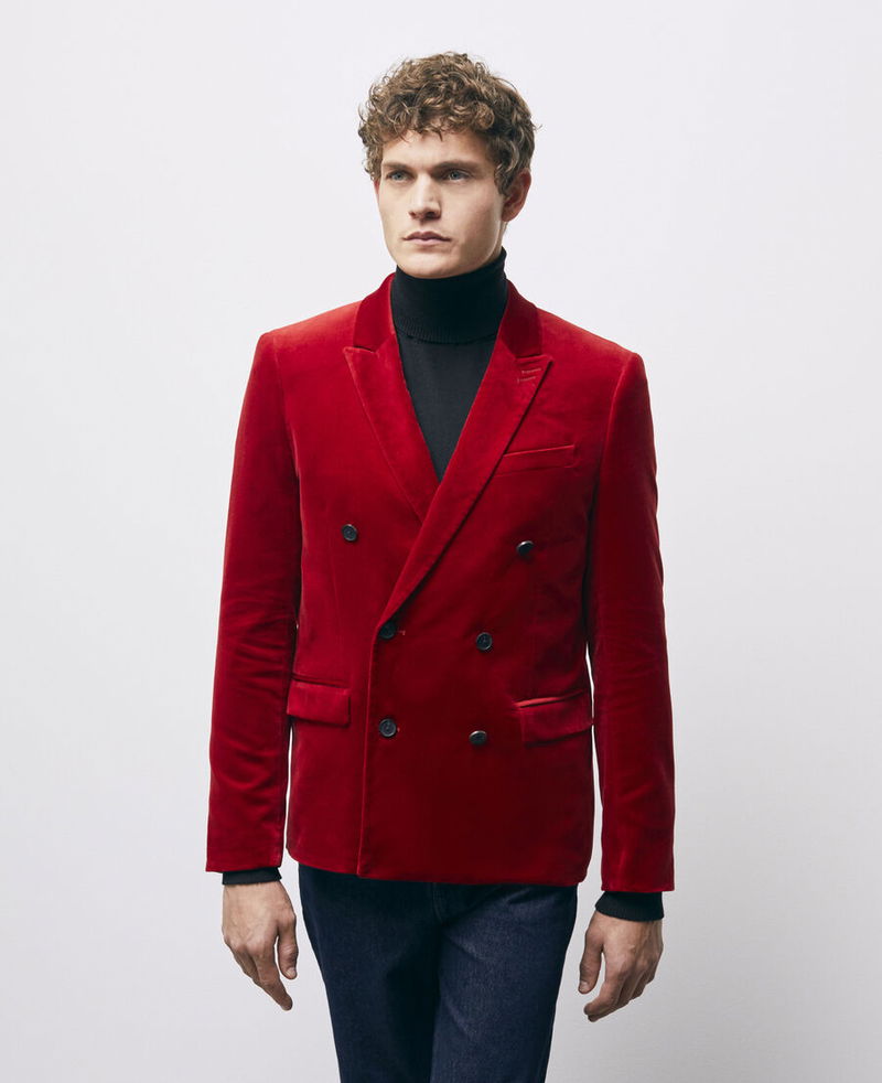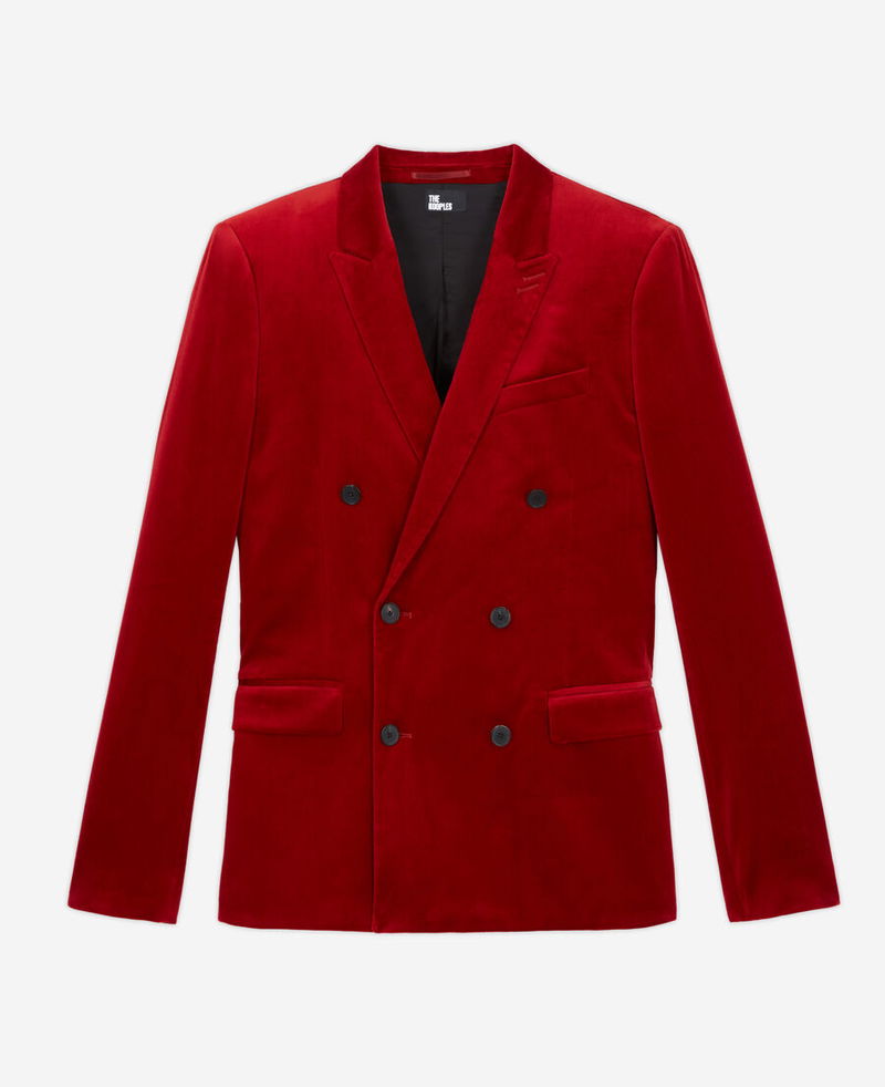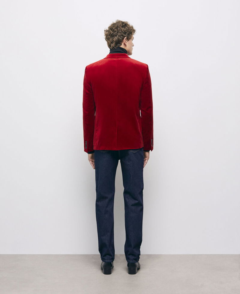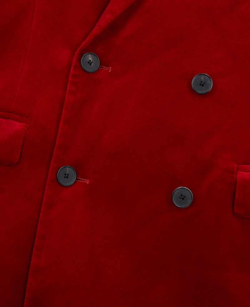 Red double-breasted suit vest. 100% stretch velvet. Plain red. Straight cut. 2 side pockets. Double breasted. Large notched collar.