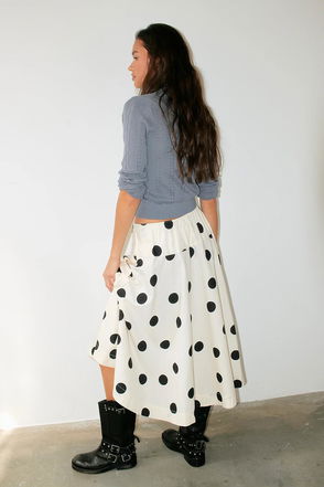 This long ecru skirt showcases our collection’s defining fabric: refined, elegant English lace. The midi silhouette we opted for is very flattering, and it features embroidered vintage-style flowers all over. For a sophisticated feel, this piece also features frills at the waist and a graphic diamond-effect trim. Wear this cotton skirt with your everyday essentials, like a basic white T-shirt and trainers.