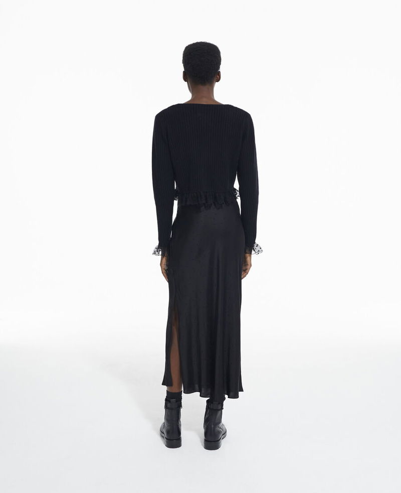 Fine black wool cardigan. 100% fine wool. Plain black. Slim fit. Dotted. Swiss fabric edges. Button closure.