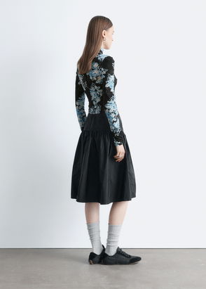 This roomy black top will give your more basic urban outfits a touch of refinement. It features our new collection's characteristic details, including gathering on the waist and neck, a small tie and smocking. It flares outwards at the bottom with light, floaty frills that accentuate the texture of the dotted-Swiss fabric. For an outfit brimming with stylish contrast, team this flowing top with high-waisted suit pants and lace-up sandals.