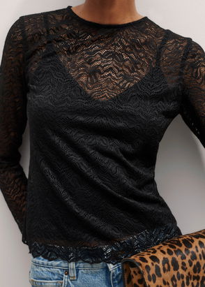 Cropped and modernised, this short black top revisits the classic style of the retro lace blouse. A must-have material this season, the dark jacquard fabric is embellished with large embroidered flowers. Romantic and refined, this piece features a high neck, light frills and a row of buttons at the top. Flaunt the exquisite details of this embroidered top by wearing it with skinny jeans, a leather belt and trainers.