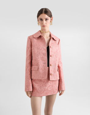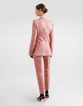 With this satin suit jacket, our Maison revisits tailor style in a refined and deliciously retro spirit. Its short, structured cut perfectly highlights the build, as does its point collar and front flap pockets. The size is accentuated by a clip on each side, flattering detail par excellence. You can adopt the total look of the season by combining this jacquard jacket with its matching pants and a pair of leather derbies.