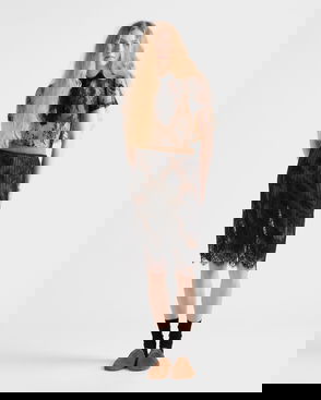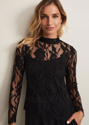 With this black lace top, we’re opted for a sensual see-through effect. Featuring long puffed sleeves and a buttoned opening with frilly edges, it offers a fresh take on the romantic blouse. The high neck is frilly as well, and the tone-on-tone leather details on the front provide extra character. You can mix things up by wearing this retro top with high-waisted grey jeans, a fitted suit jacket and heeled boots.