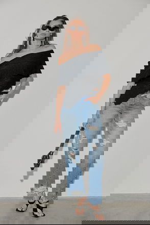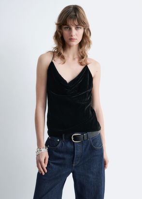 This black lace top brings refinement and subtle detailing to the forefront. Boasting an intense shade, it’s fitted, and features long puffed sleeves and a row of covered buttons down the front. The elastic band is a modern touch, and the flounce at the bottom provides volume. For an everyday look, you can wear this light top with high-waisted suit trousers, a crocodile-print belt and heeled boots.